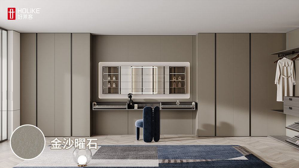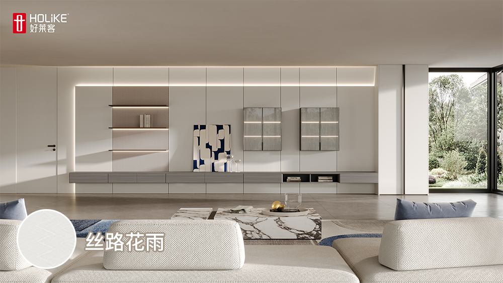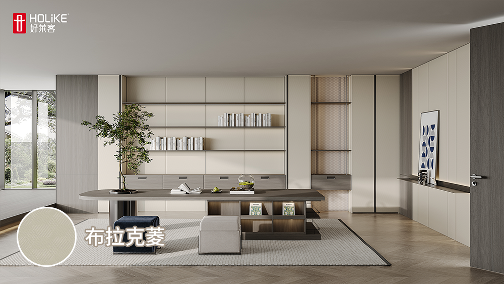 一个宝藏家居品牌,不仅需要具备良好的“实用”性能,还要有对生活“品质”的追求。好莱客准分子亲肤板专从自然、历史文化中汲取灵感,选取温暖治愈的大地色系碰撞简洁几何线条的天然纹理,形成3款低饱和度细腻花色:布拉克菱、金沙曜石、丝路花雨。远看似纯色,近看肌理灵动高级,让宝爸宝妈们不出家门也能重塑舒逸心居,唤醒空间新感知,实现心理和视觉上的双重舒适体验。