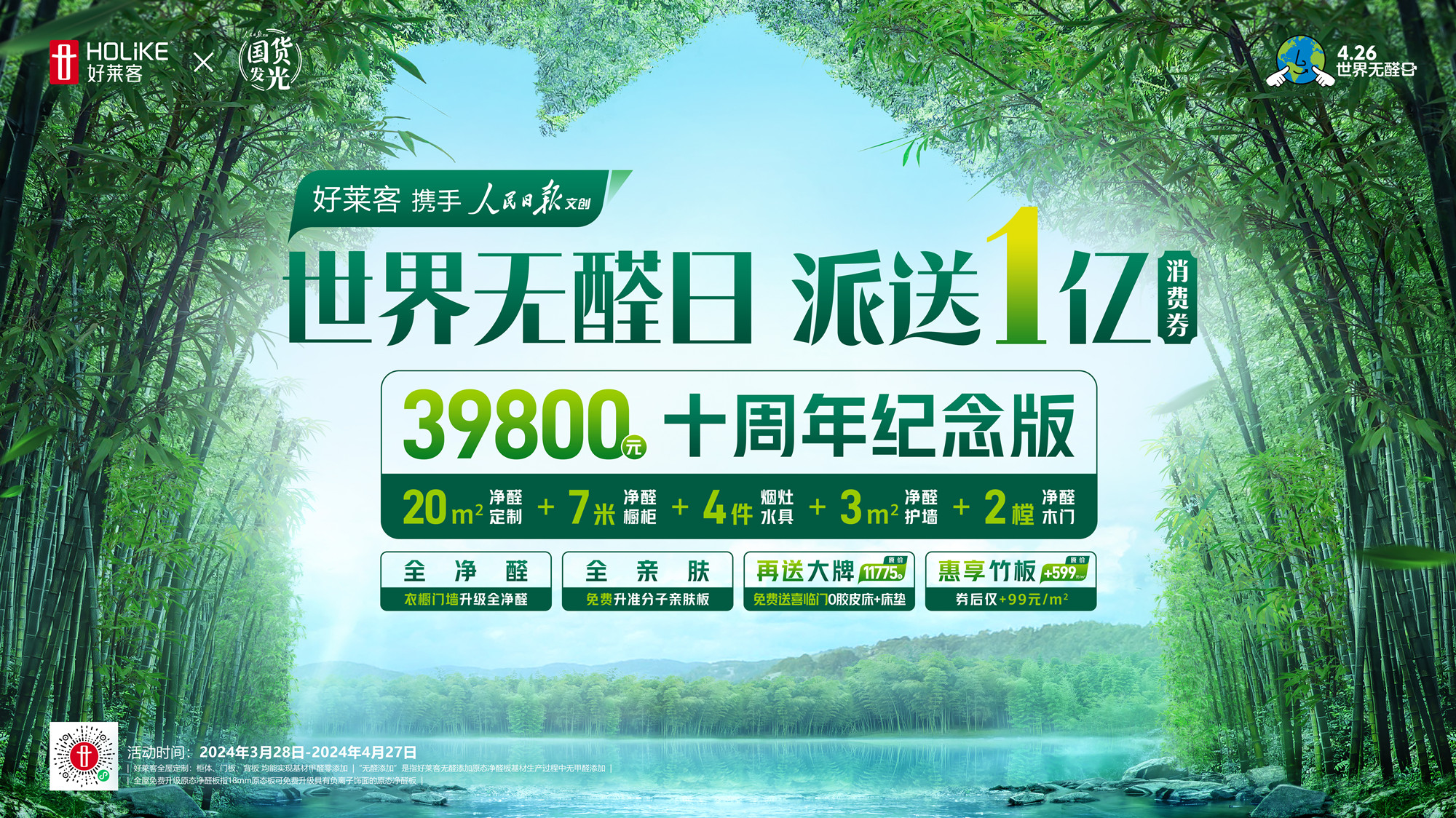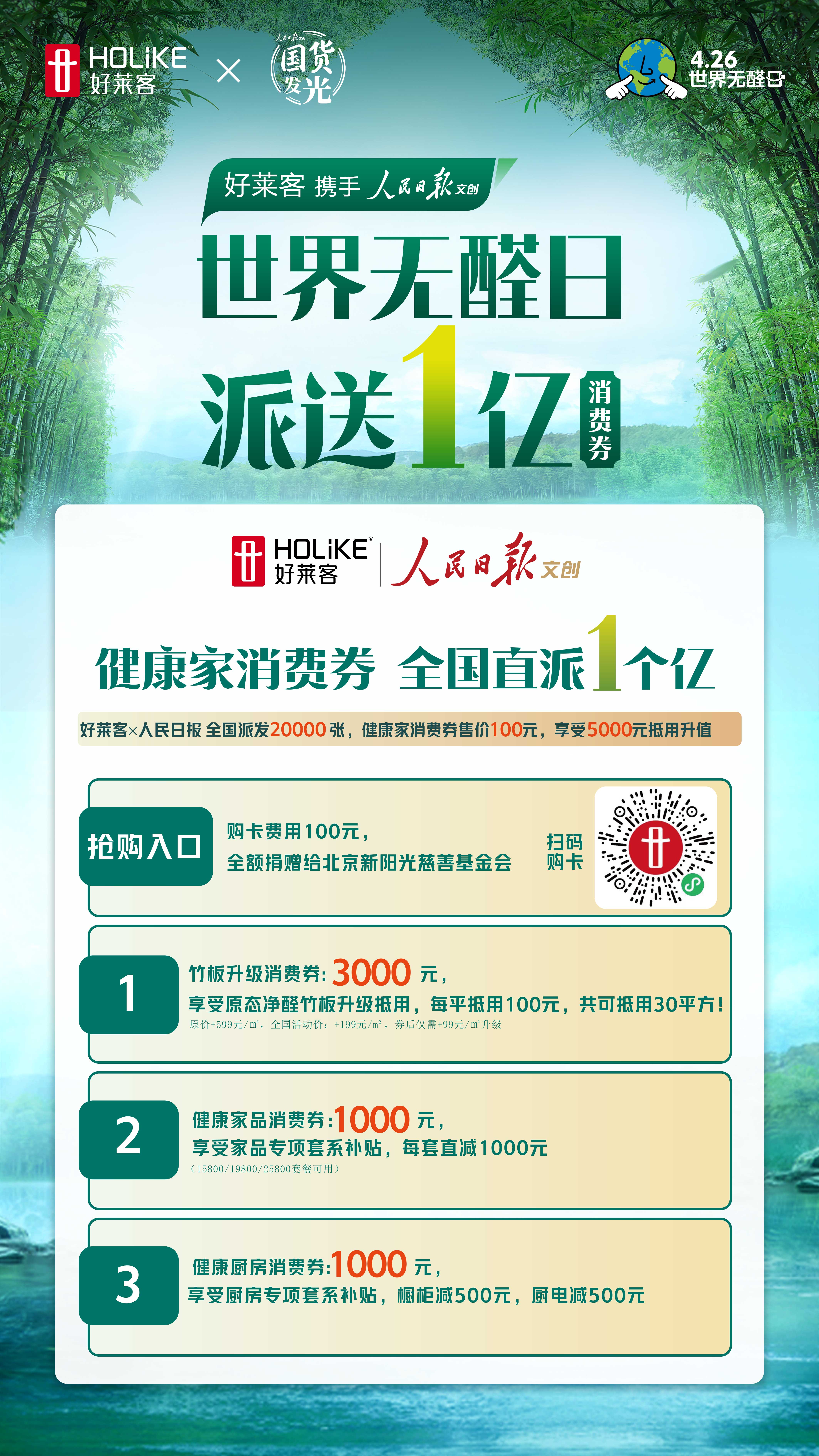 2024世界无醛日迎来了10周年,为顺应国民高品质健康生活的需求,在稳增长、促消费的主旋律下,好莱客以“世界无醛日 竹构健康家”为主题,携手权威官媒「人民日报文创丨国货发光」重磅发起国货发光美好生活季派券惠民活动,面向全国消费者派发1亿健康家消费券,以更大的福利政策让利全民,让绿色健康的高品质家居产品更广泛地走入寻常百姓家。