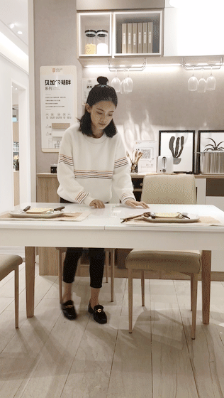 选用合适长度的餐桌,偶尔想来个家庭聚会也不怕拥挤。如果担心餐桌不够长?那么了解一下伸缩餐桌吧。