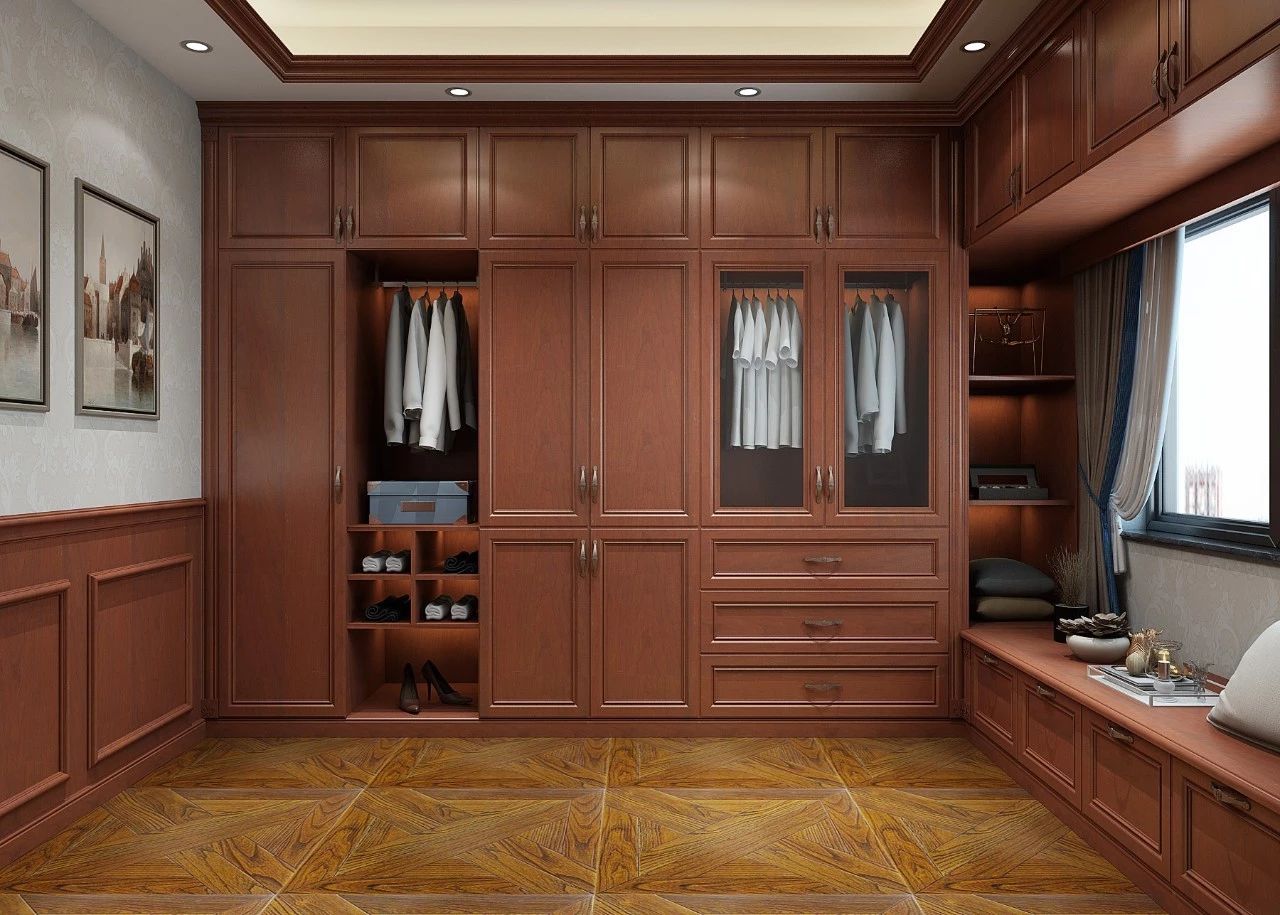 嵌入式衣帽间不需要独立的封闭空间,只要在家里找出一块面积在4㎡以上的空间,依据空间形状,制作几组柜体和内部间隔即可。