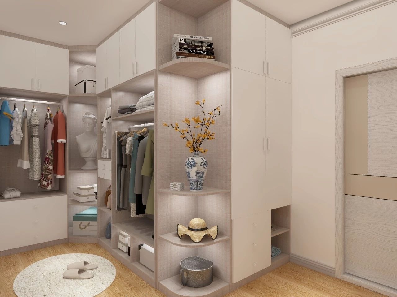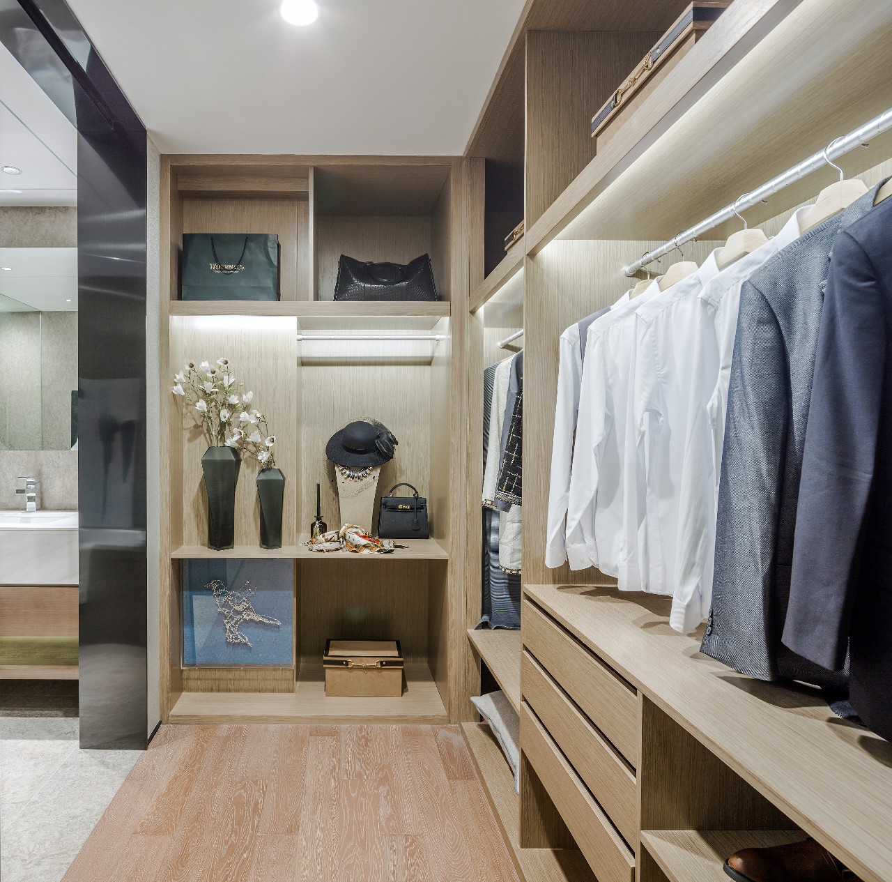嵌入式衣帽间的空间利用率超高,比较节约面积,能让家里不知如何安排的角落成为收纳衣物的空间。
