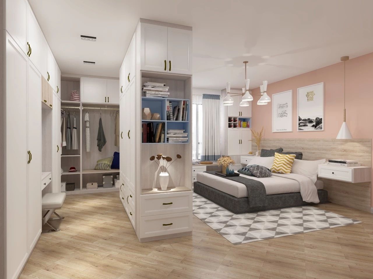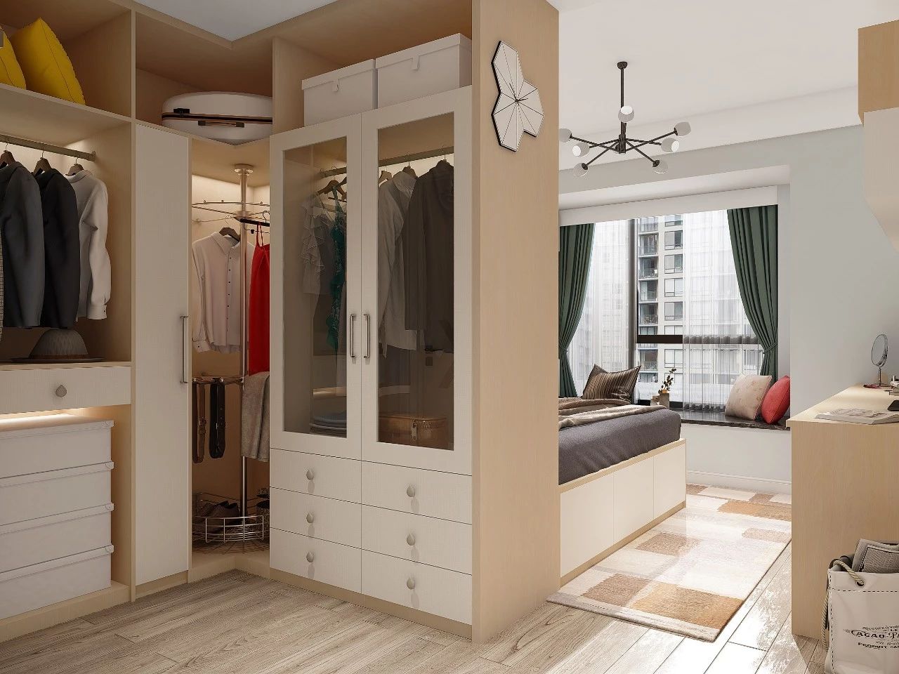 空间规划做好了,卧室里面还能做步入式衣帽间。步入式衣帽间的储存空间完整,衣服陈列整齐,存取方便,有充裕的活动空间。一般配有镜子,以方便试衣,可以用门帘或推拉门做隔断。但面积要保证在4㎡以上。
