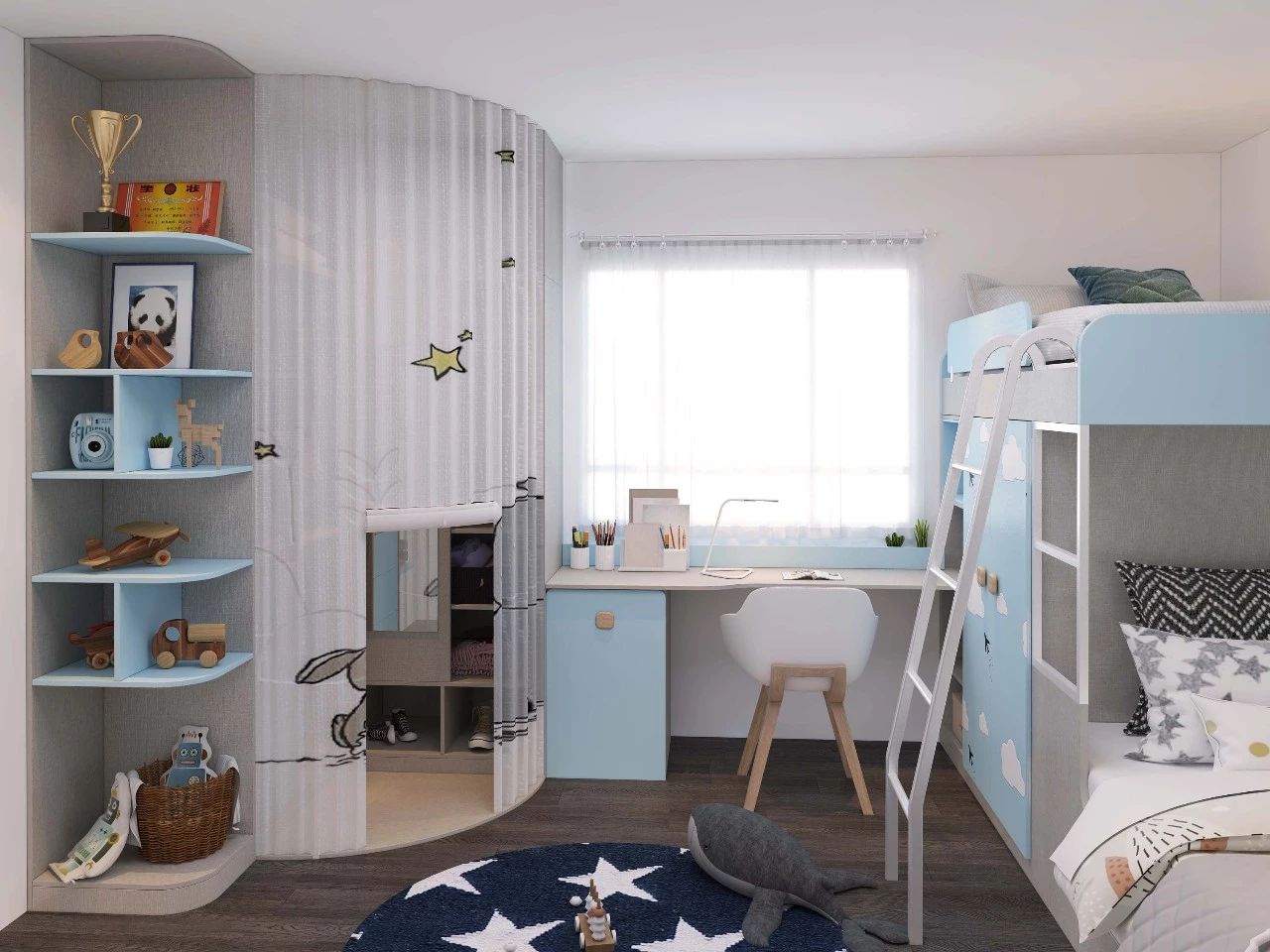 ▲在卧室的转角位置采用门帘做隔断,打造步入式衣帽间,收纳孩子四季的衣物,还能保护隐私,从小就是个精致的宝宝。