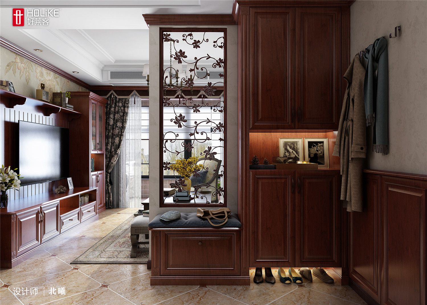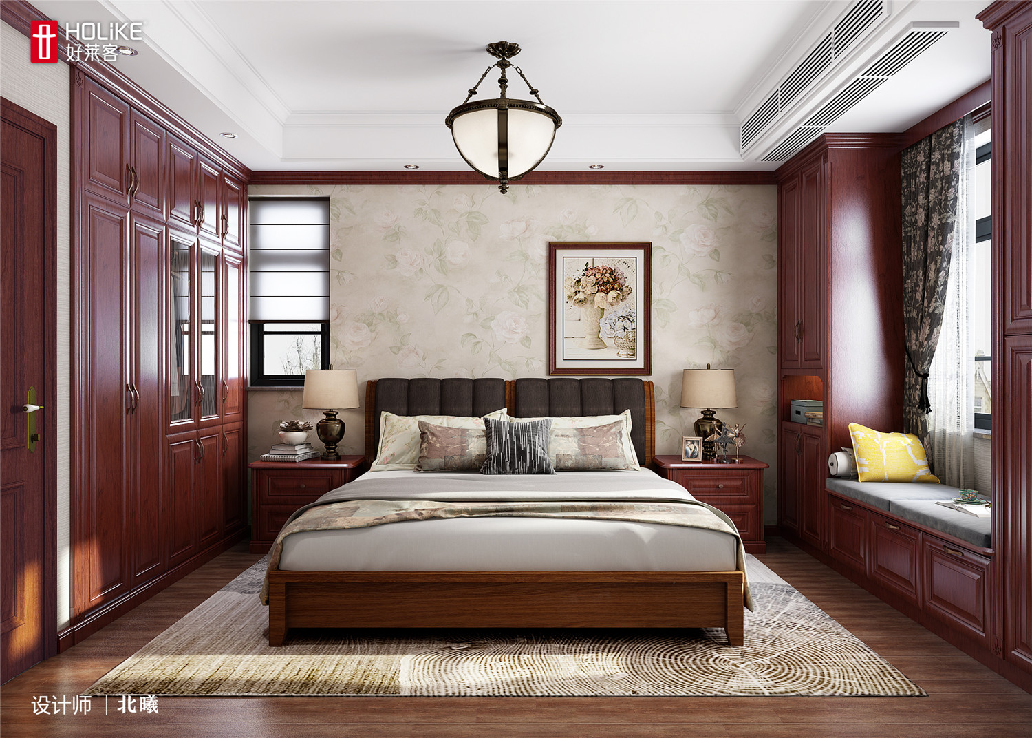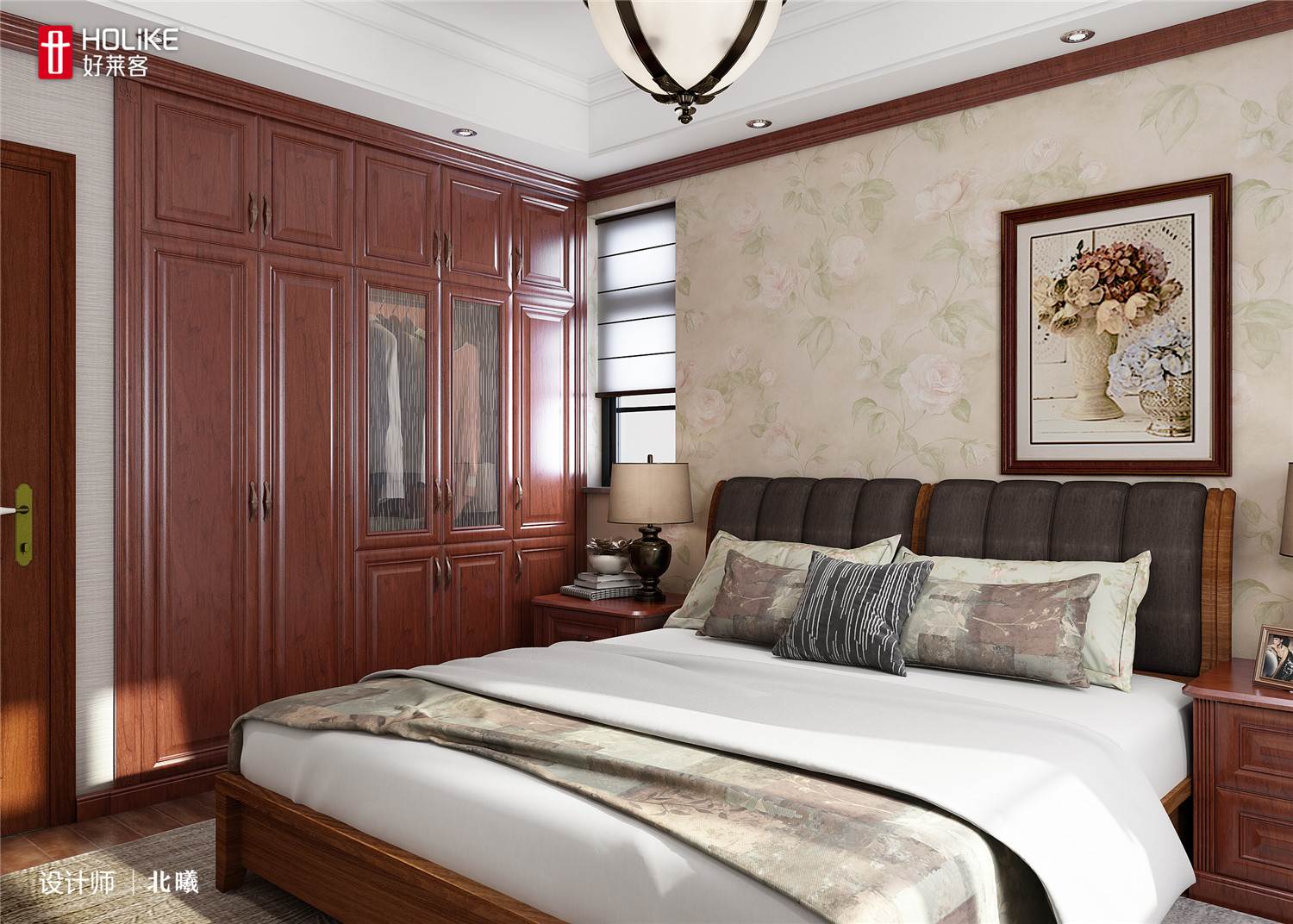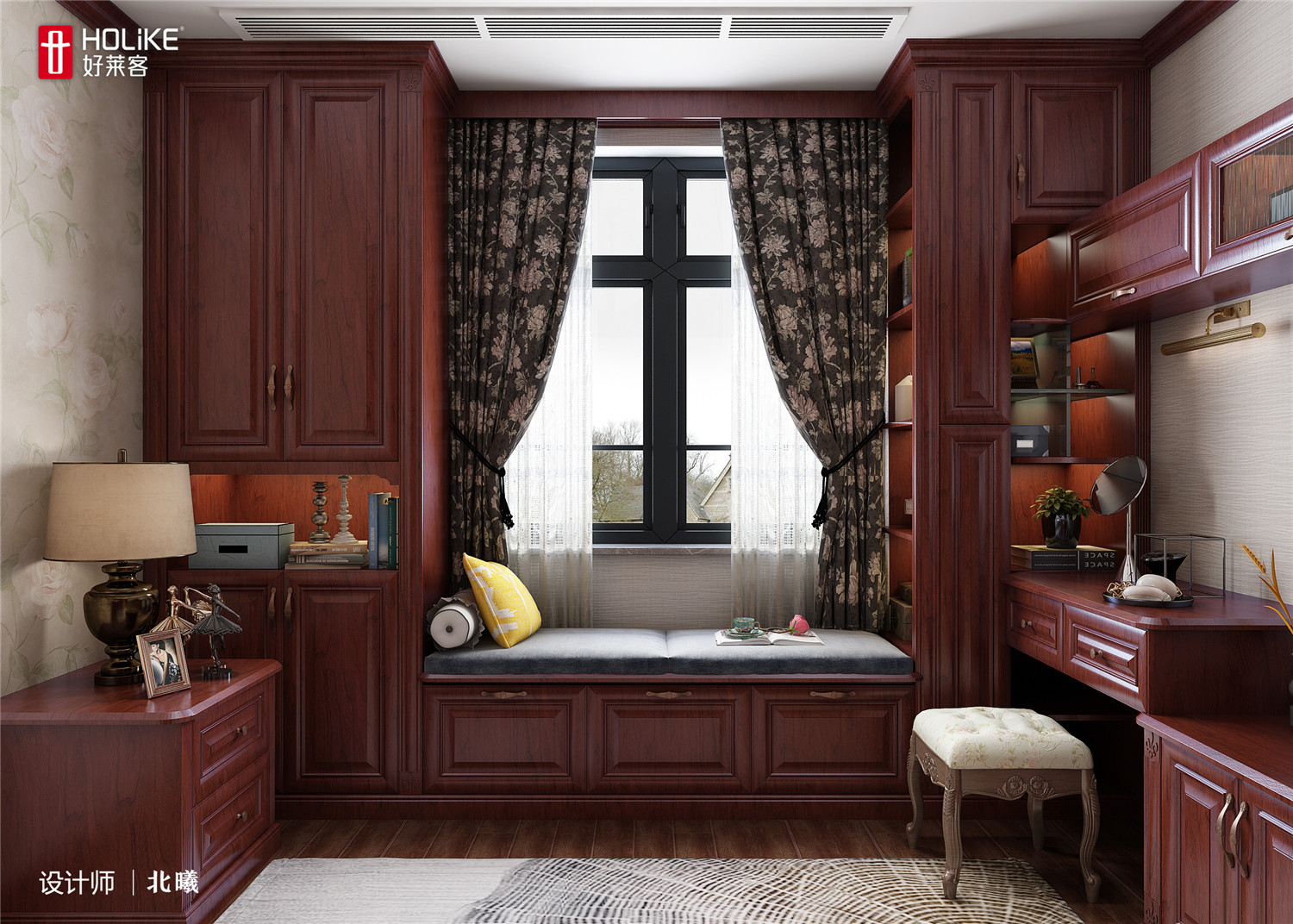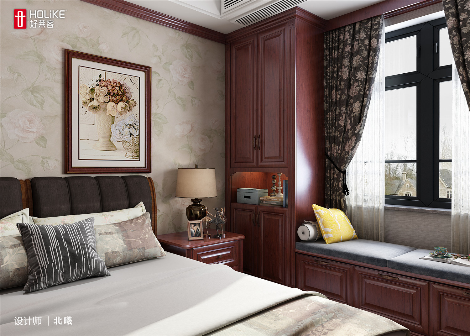 全屋采用深棕色的定制家具,结合花鸟的元素,营造出沉稳而休闲的美式乡村风,非常适合业主退休的爸妈居住。