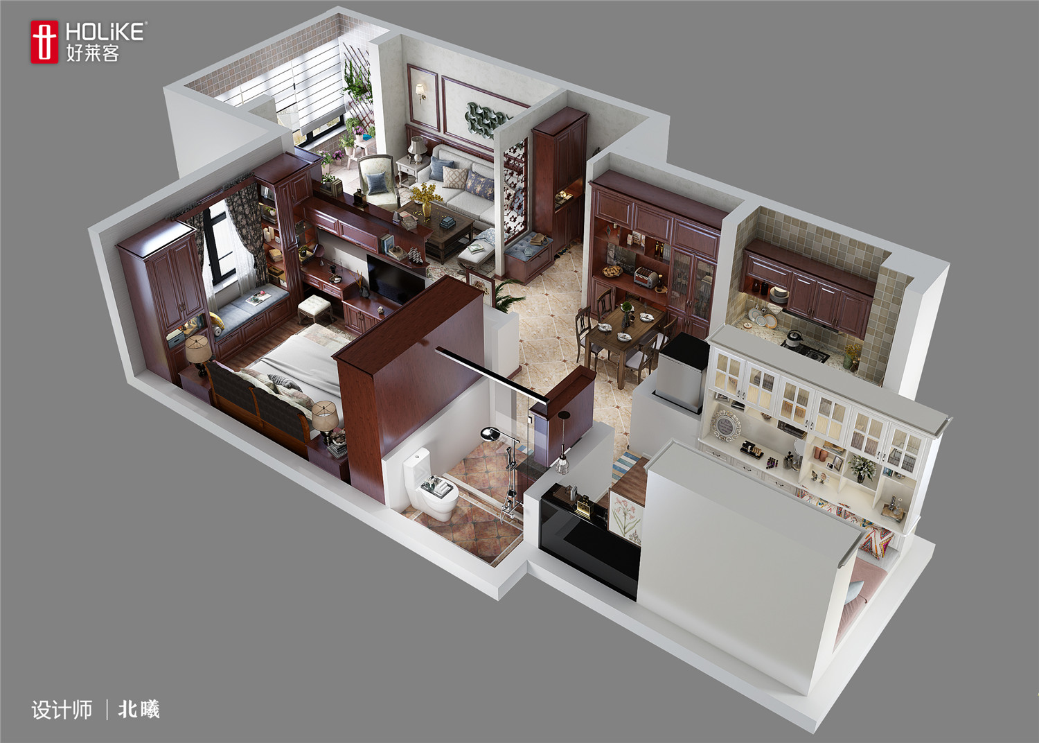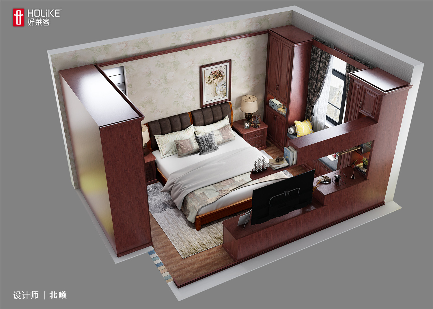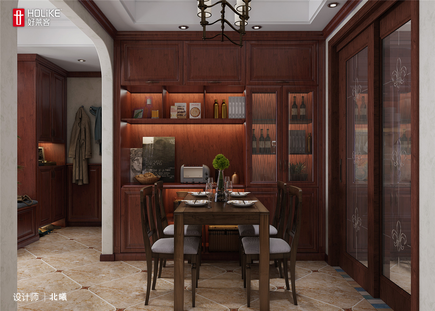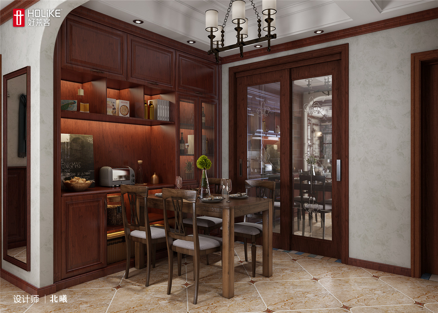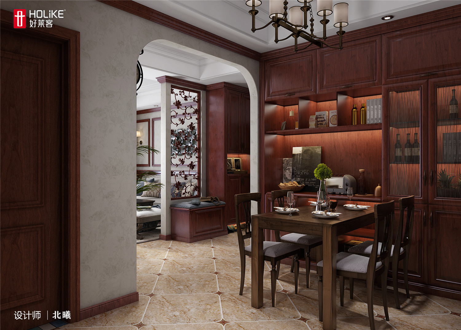 全屋采用深棕色的定制家具,结合花鸟的元素,营造出沉稳而休闲的美式乡村风,非常适合业主退休的爸妈居住。