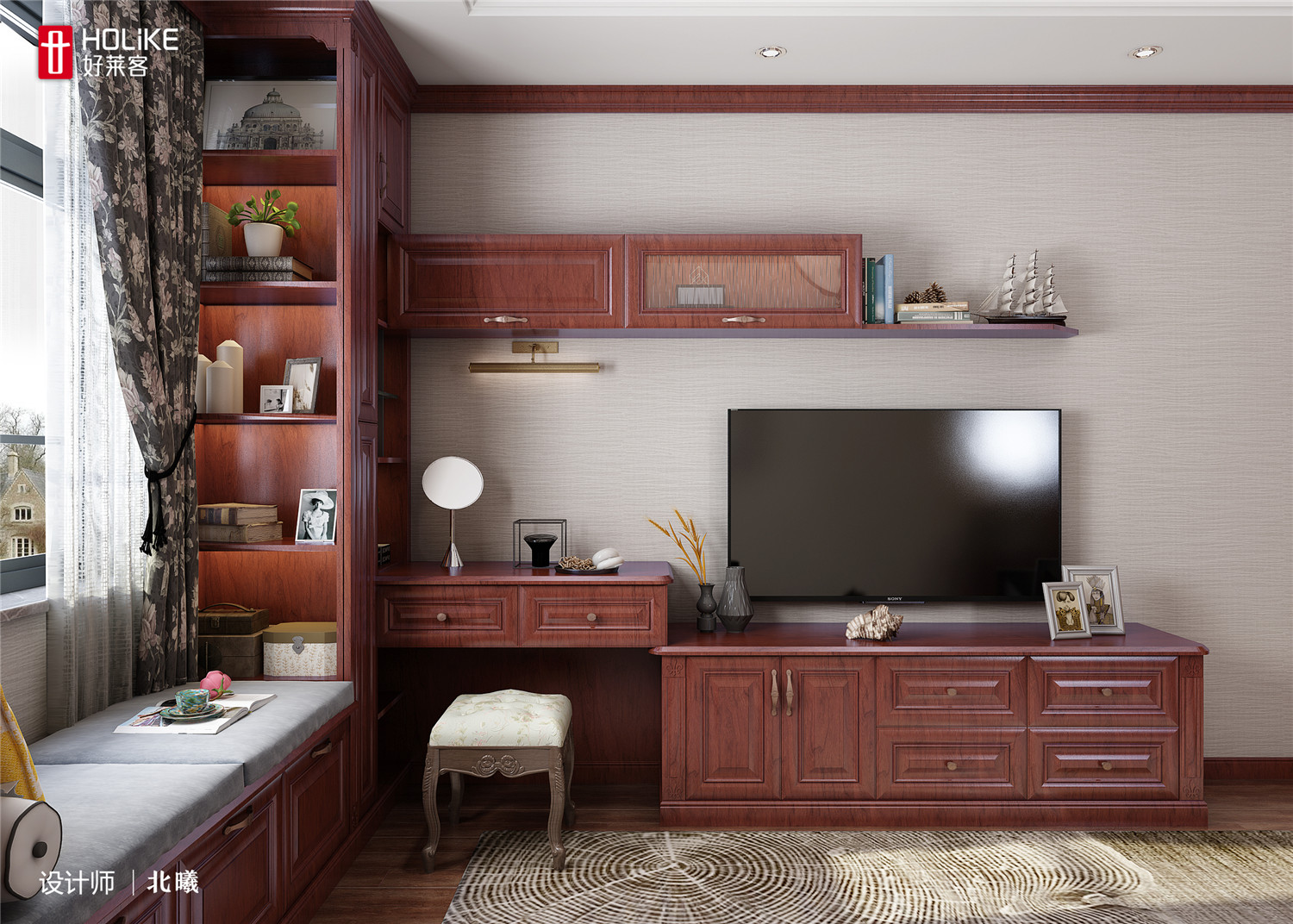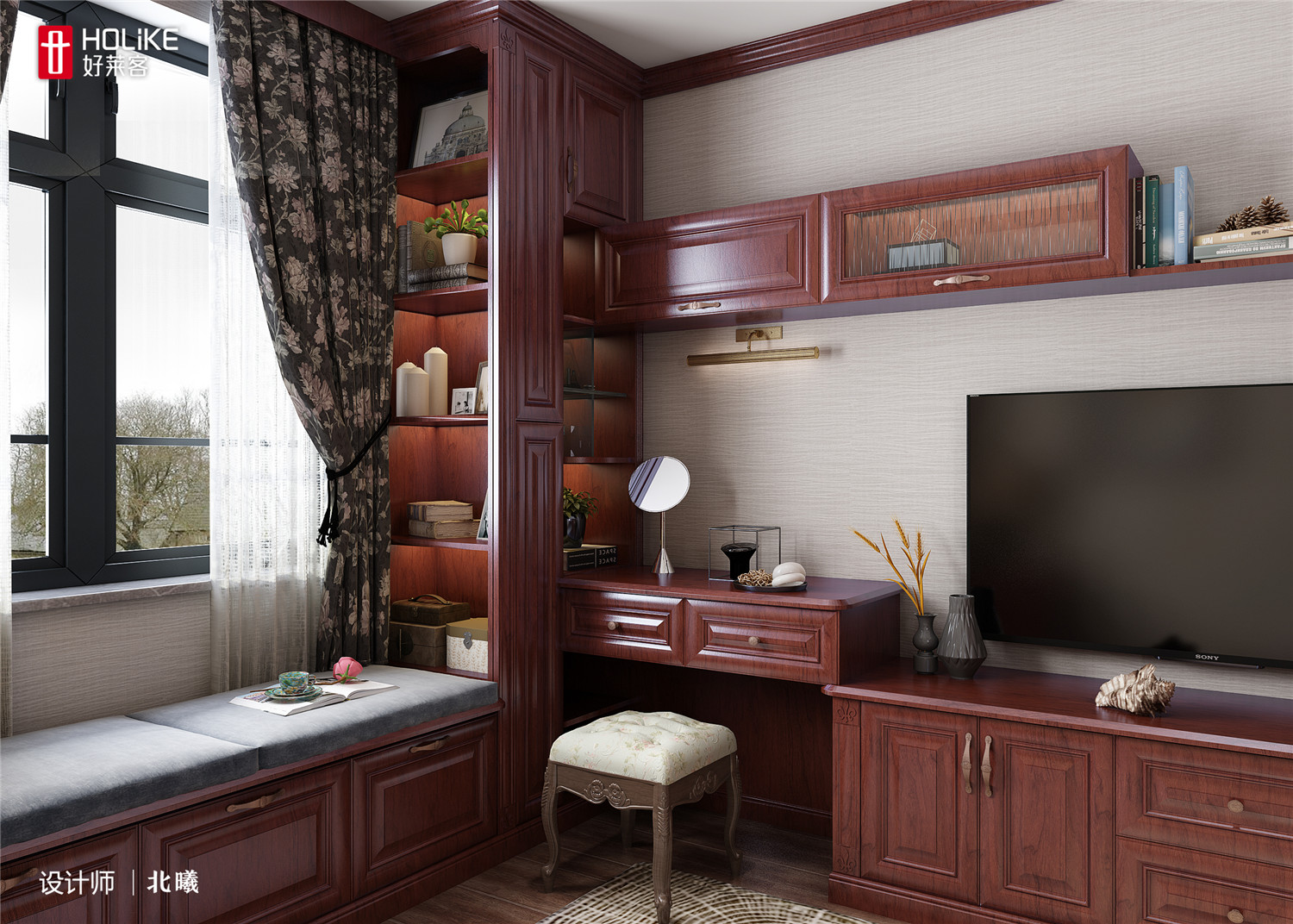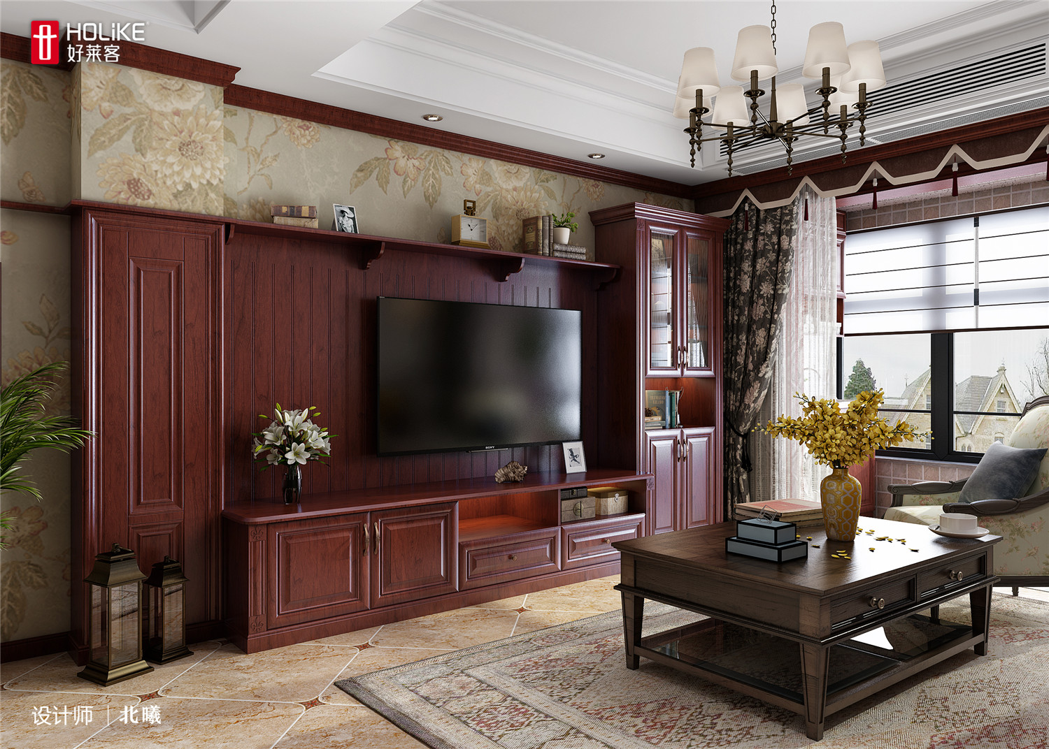 电视柜与护墙板、书柜的整体家具设计,更有整体感。护墙板顶部做了搁板,方便摆放装饰品。所有的门板都采用吸塑做旧工艺做出曲线的纹理,彰显美式风的典雅品味。