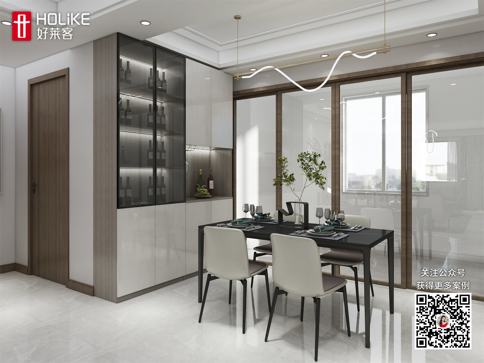 餐厅延续客厅整体的基调,餐边柜采用玻璃掩门和镂空设计更加突出轻奢质感,再加上不规则吊灯的点缀,使整个空间在轻奢的氛围中注入一份灵动之感。