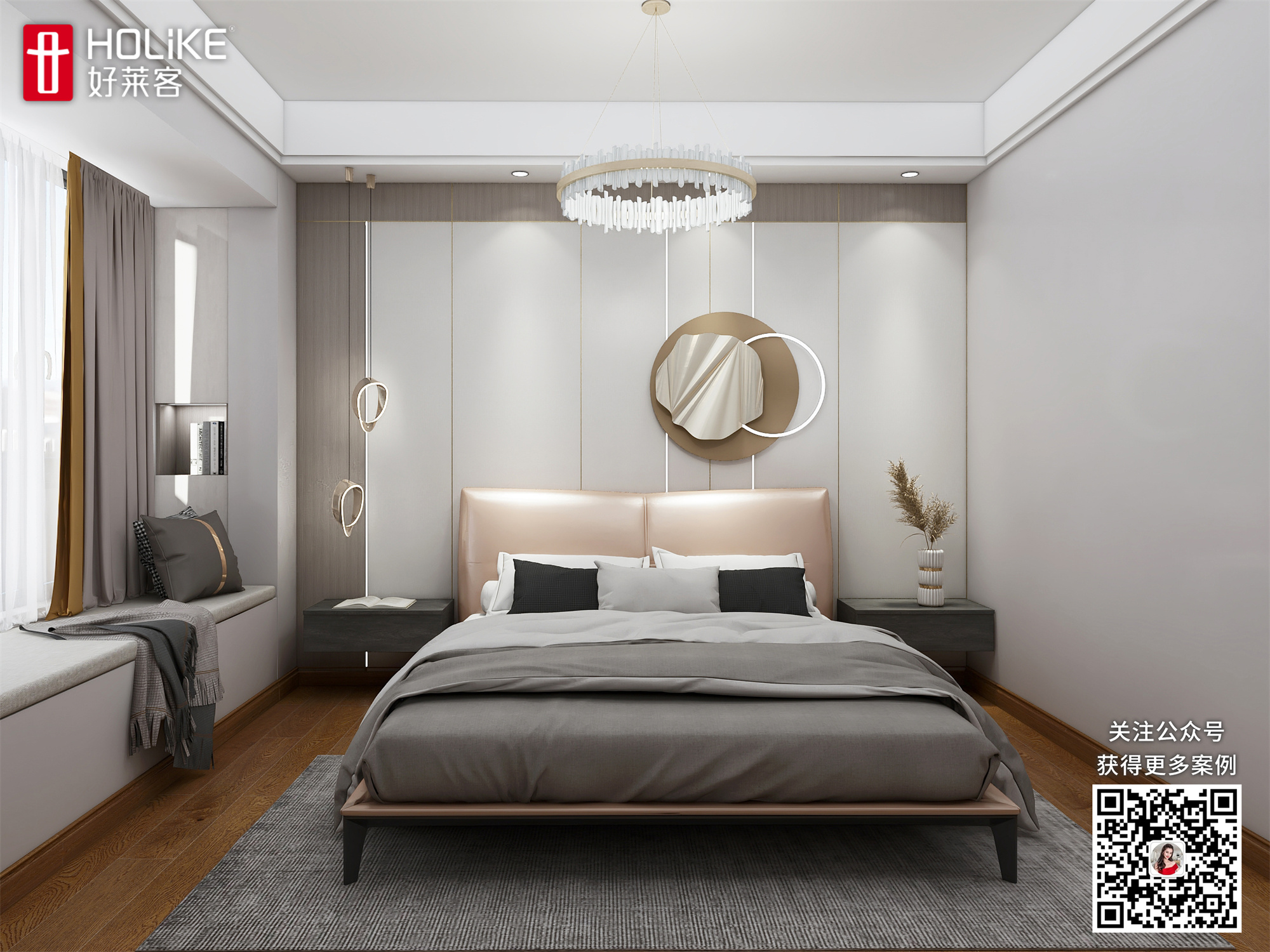 主卧设计背景墙,以黄铜色为点缀,结合白色、灰色等色彩,营造出简约淡雅、清新舒适的氛围。每天走进这里,纯姐都能卸下一身疲惫,彻底放松。