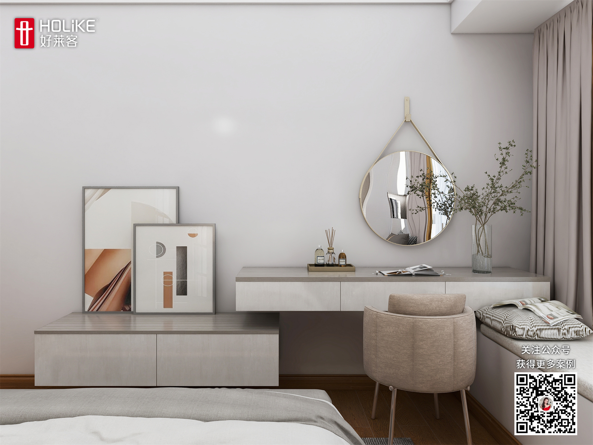 床尾边柜、梳妆台和飘窗储物柜一体化设计,既能满足纯姐日常梳妆,也可以放置夫妻俩的睡前读物和珍藏的摆件,一举两得!柜体采用缪斯灰和冰川灰花色搭配,质感满满,大大提升了空间的奢感。