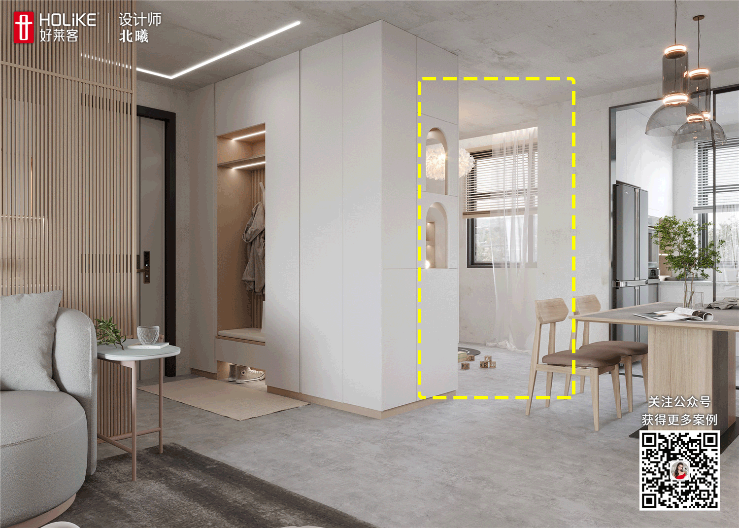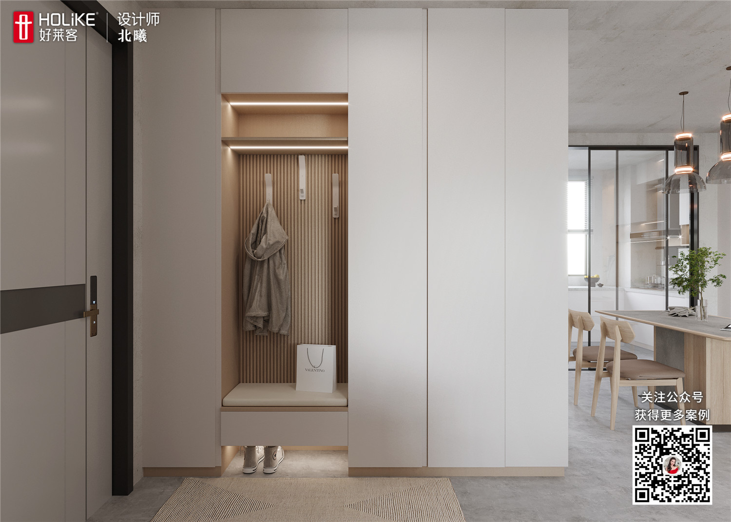 玄关柜采用一门到顶设计,储物空间强大,一家三口的鞋子和杂物都能有序收纳。柜子特意留出一个区域做挂衣区和卡座,方便挂衣服和包包,平时坐着换鞋也更加舒适,尤其适合有孩子的家庭。