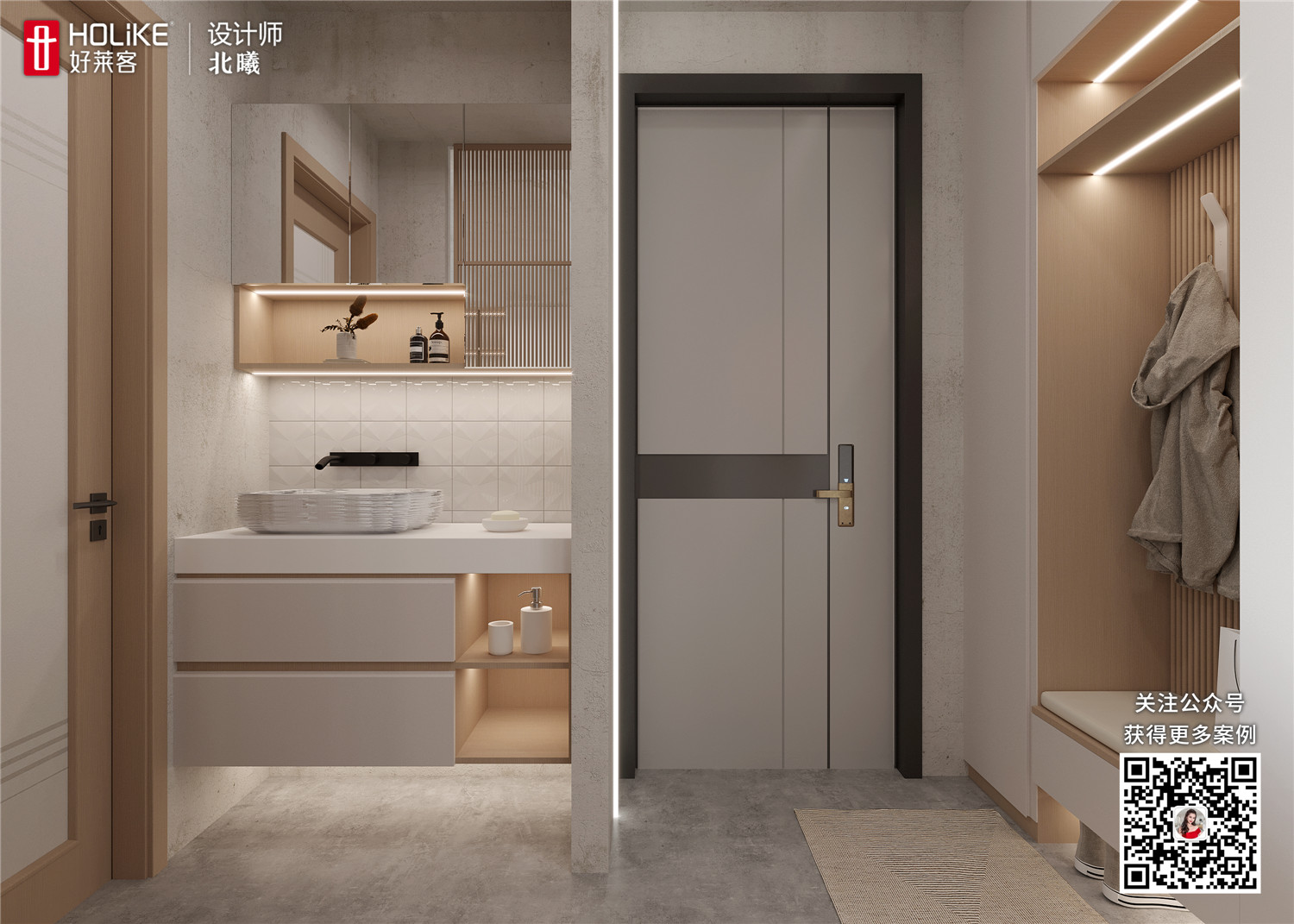 业主家的户型其中一个亮点在于公卫就在玄关旁,设计师特地将洗漱区外置,业主一家每次回到家,换好鞋子后都会先到洗漱台把手洗干净再进入屋内,一定程度避免把外面的细菌带回家里~
