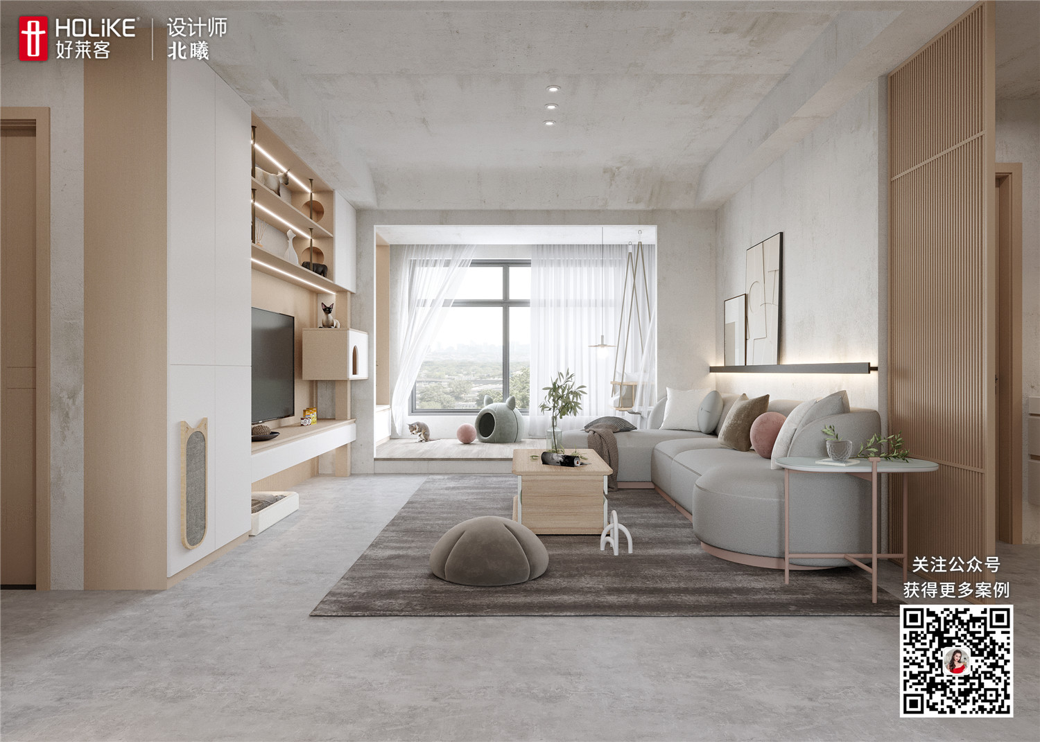 熊孩子的玩乐需求已经得到解决,喵星人的活动空间当然也不能忽视。设计师经过多番考量,决定打通客厅和阳台,将这里作为猫咪的主要活动场所。