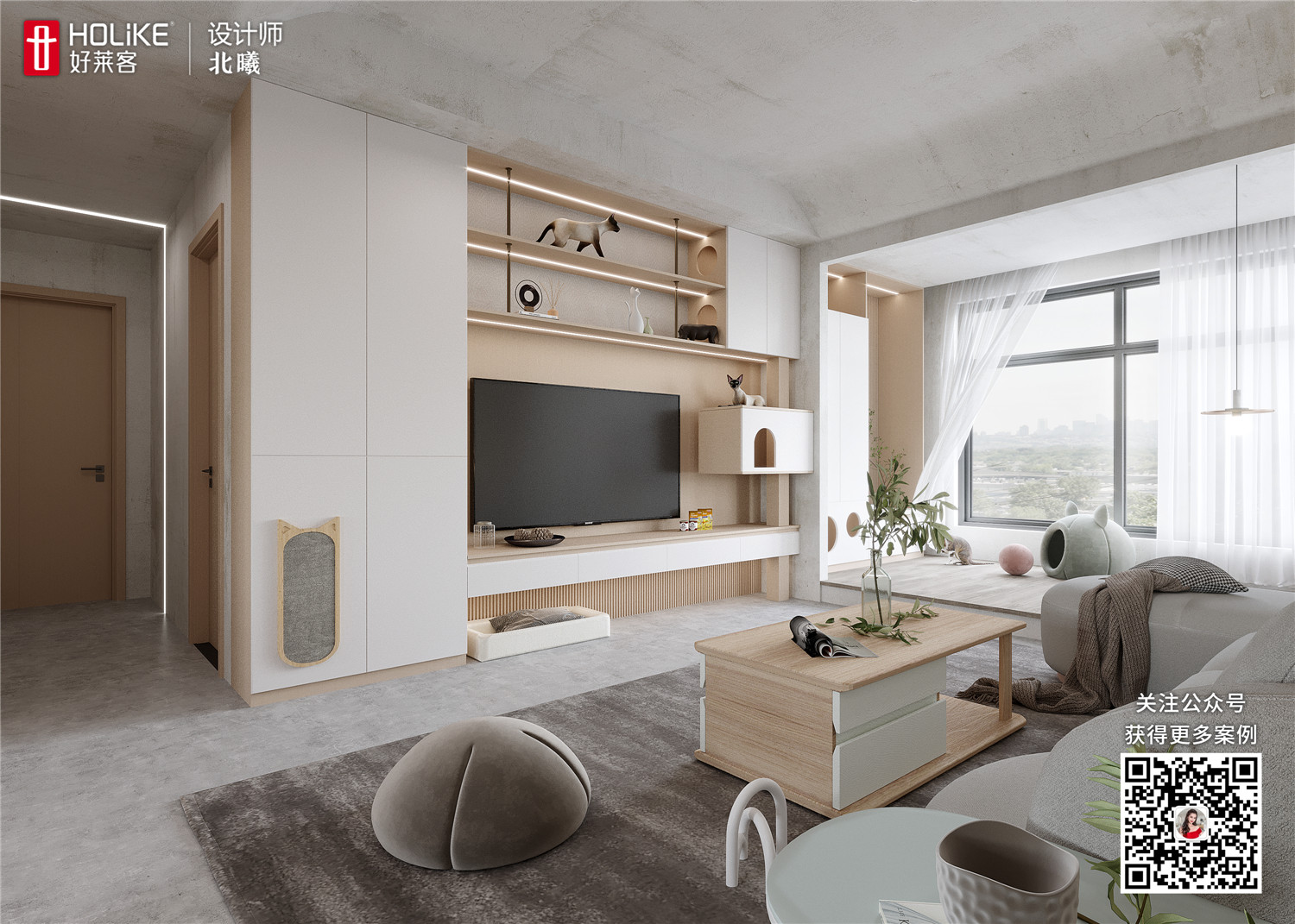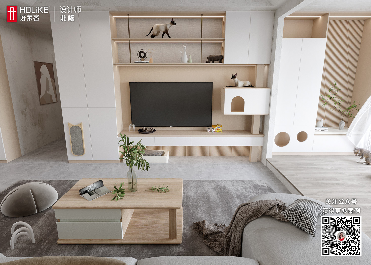 为了同时满足全家人和猫咪的日常居住需求,这个空间的设计颇具心思。组合式电视柜既能收纳业主的物品,同时也是猫咪步道,让喵星人可以随意穿行。阳台柜的柜门采用圆孔设计,也很适合喵星人玩耍。