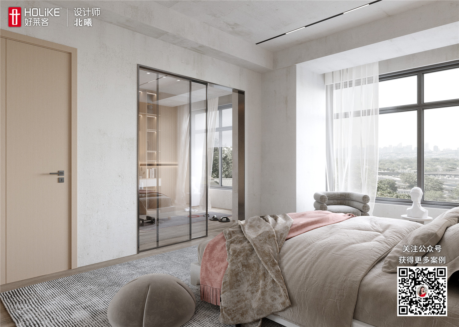 男主人大部分时间都在家办公,书房是他的主要工作场所,但他不喜欢在局促的空间里办公,希望工作氛围更加轻松自在。设计师便将主卧和书房打通,利用玻璃推拉门隔开,打造通透的一体化多功能区。