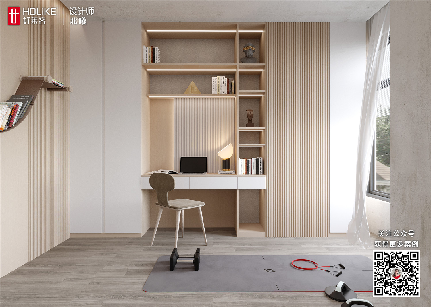 书房量身定制书桌柜,可办公可收纳文件资料,多余的空间就铺上了瑜伽垫以及放置健身器材,办公坐久了,还可以做运动放松一下~