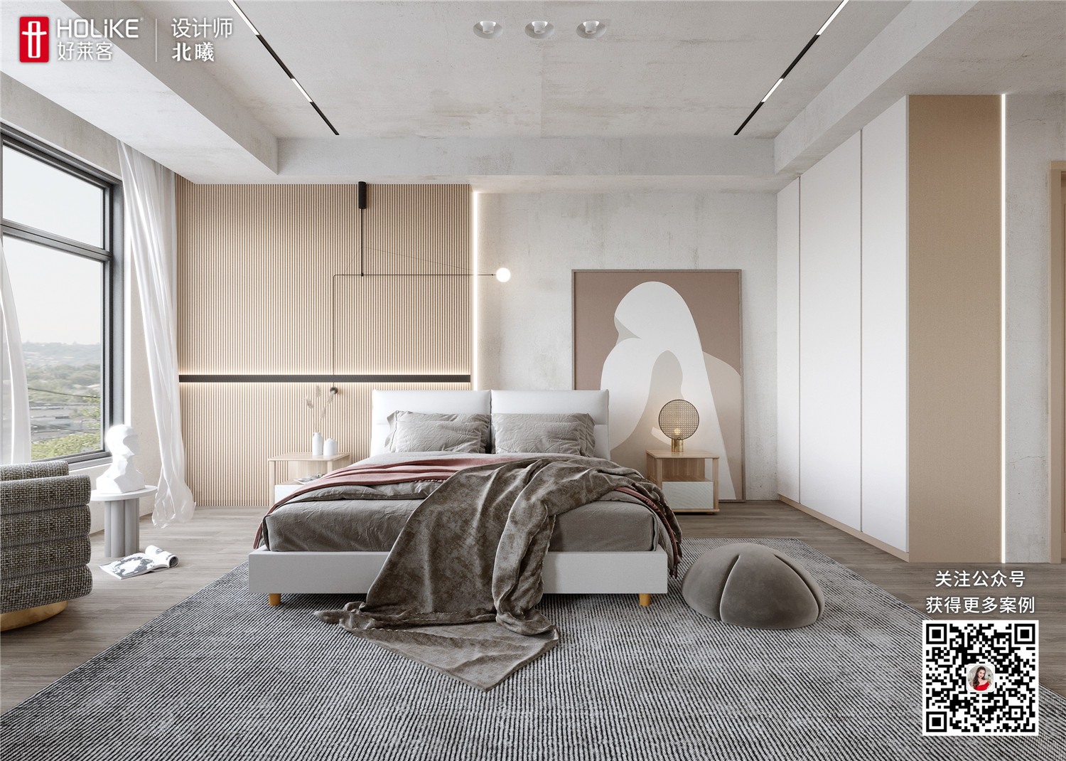 主卧休息区的背景墙局部采用素杏杨木花色的浮雕板,起到点缀空间的作用,营造一种自然宁静的舒适氛围。床边的到顶衣柜主要用来收纳过季的衣物,这样衣帽间就能专门挂放当季衣物,找衣服就更便捷了。