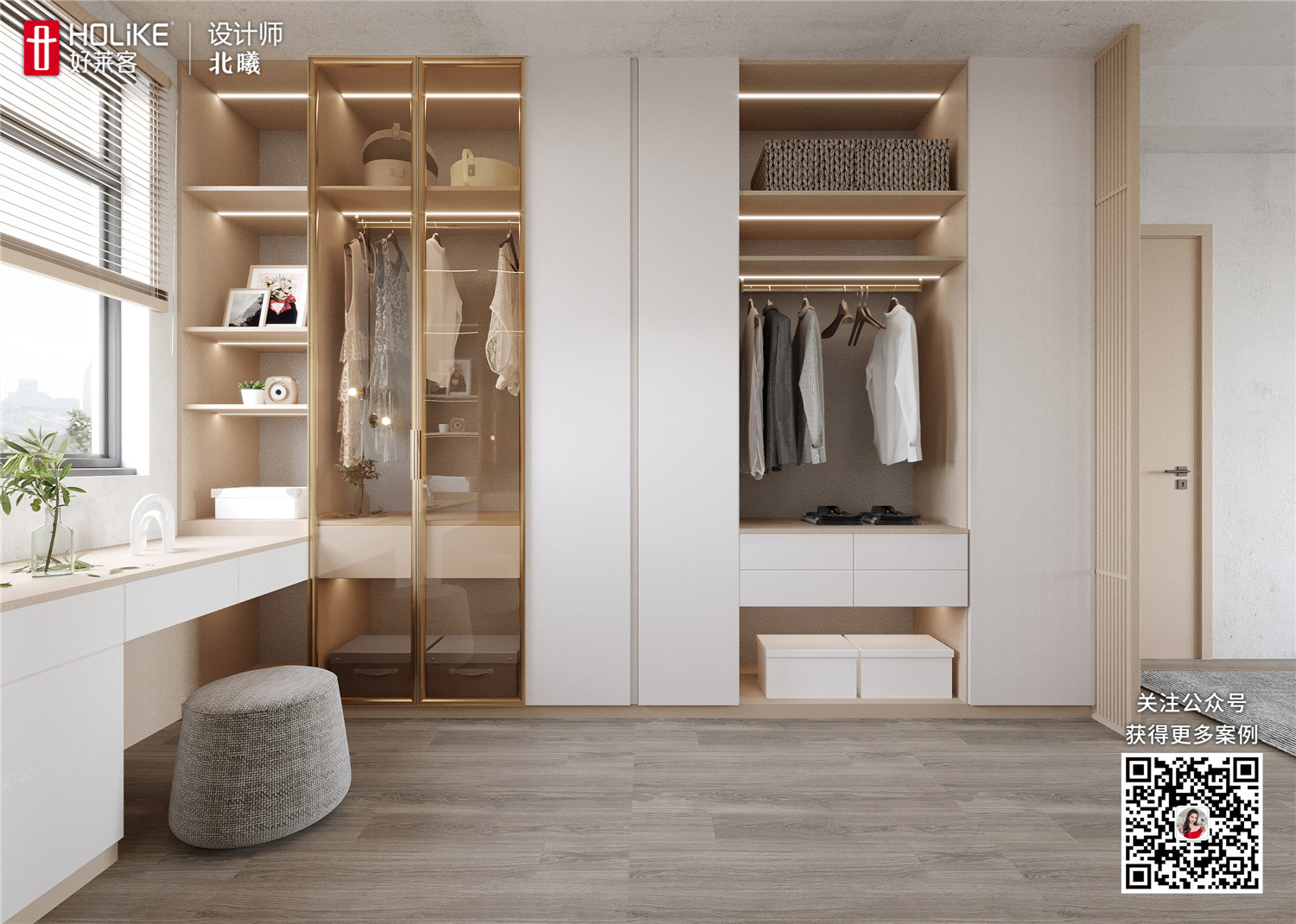 主卫前方的区域便是衣帽间,kiki选衣服、换衣服、梳妆打扮都能一站式搞定,非常方便。