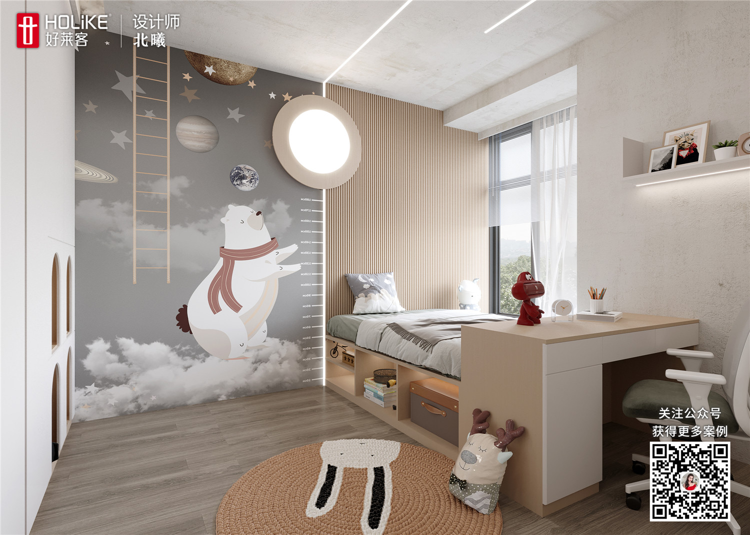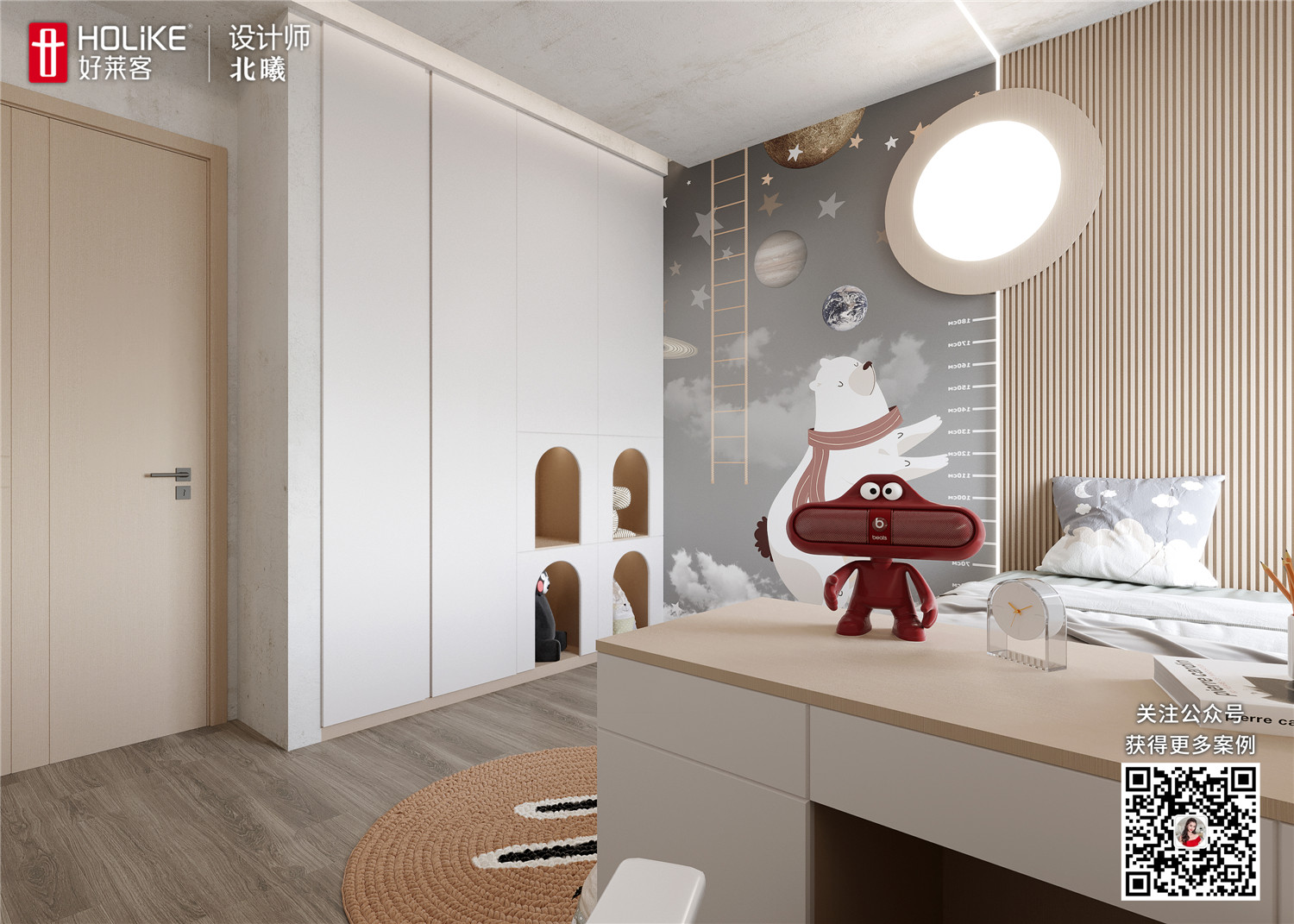 顶天立地式衣柜,储物量max,孩子再多的衣物都能轻松收纳。部分柜门采用弧形门洞设计,用来展示玩具能够大大提升空间的趣味性。