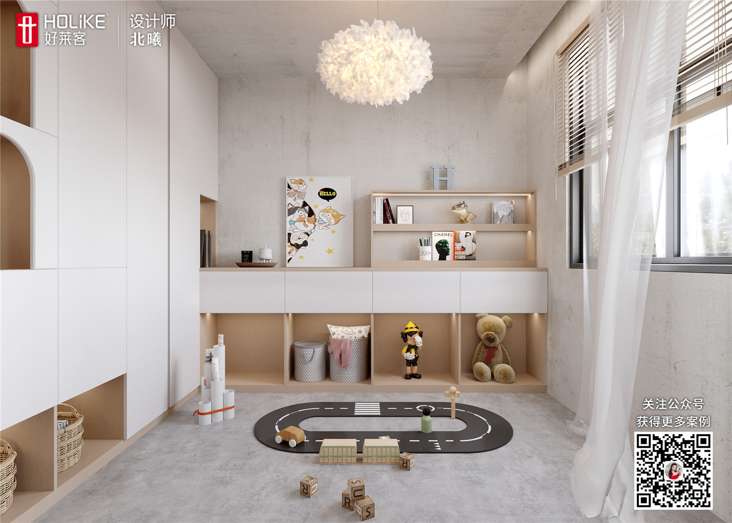 儿童玩乐区定制了L型的到顶柜+半高柜,既提供了充足的玩具收纳空间,又不会让人感到压抑。半高柜下方做一排开放柜,玩具随手就能放好,有利于培养孩子的收纳习惯。