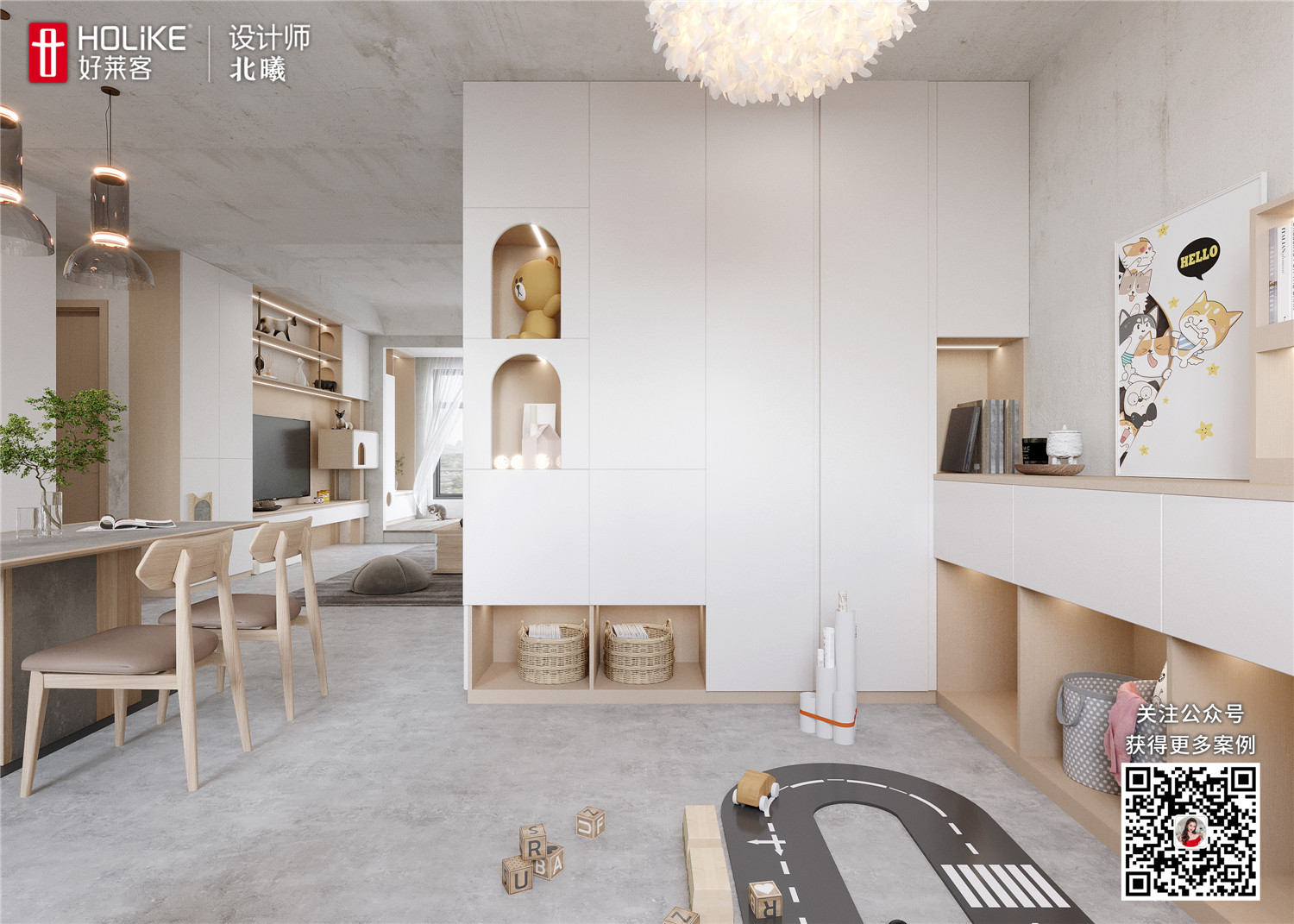 业主家原本在玄关旁有一个杂物间,为了提升空间利用率,设计师便将其拆除做成开放式玩乐区,这里秒变业主4岁儿子的专属小天地。