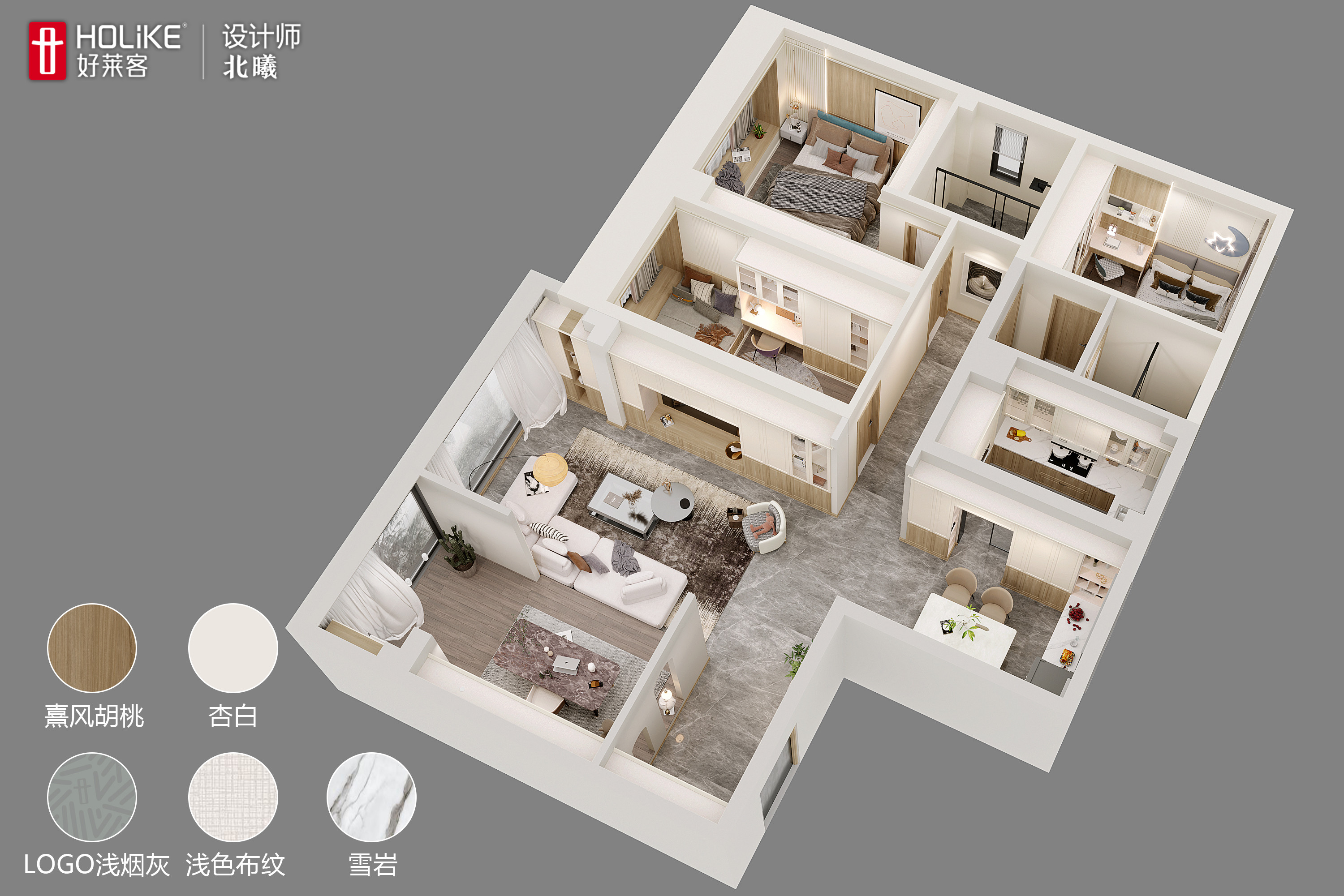 女儿房延续暖色木纹的基调,熹风胡桃木纹和素色杏白搭配,提高了空间整体的层次和质感,营造了温馨自然的睡眠氛围。