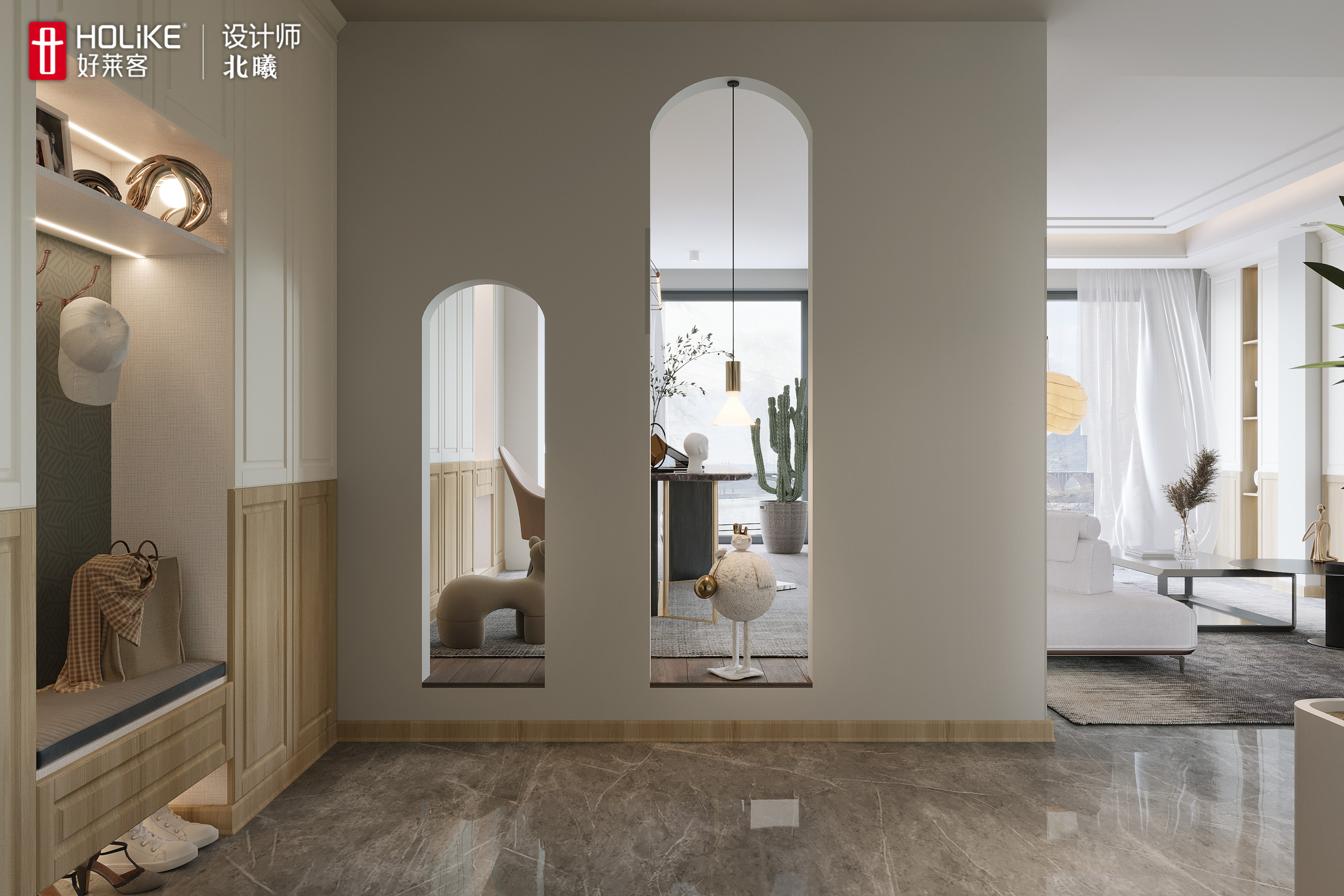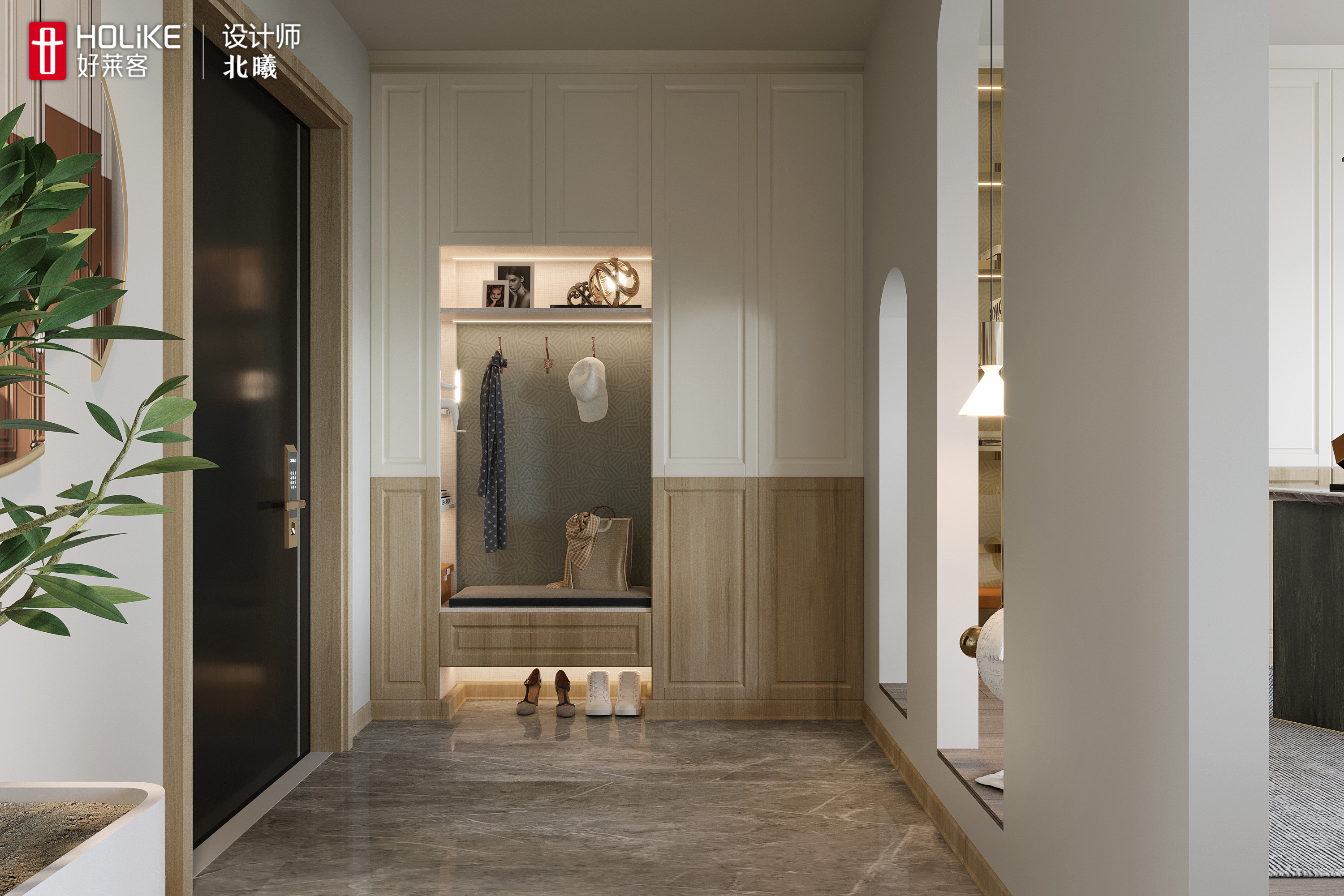 入户左侧打造到顶玄关柜,卡座换鞋凳、开放柜和掩门柜分区明确,收纳和展示功能齐全,可以满足一家人日常进出门的需求。
