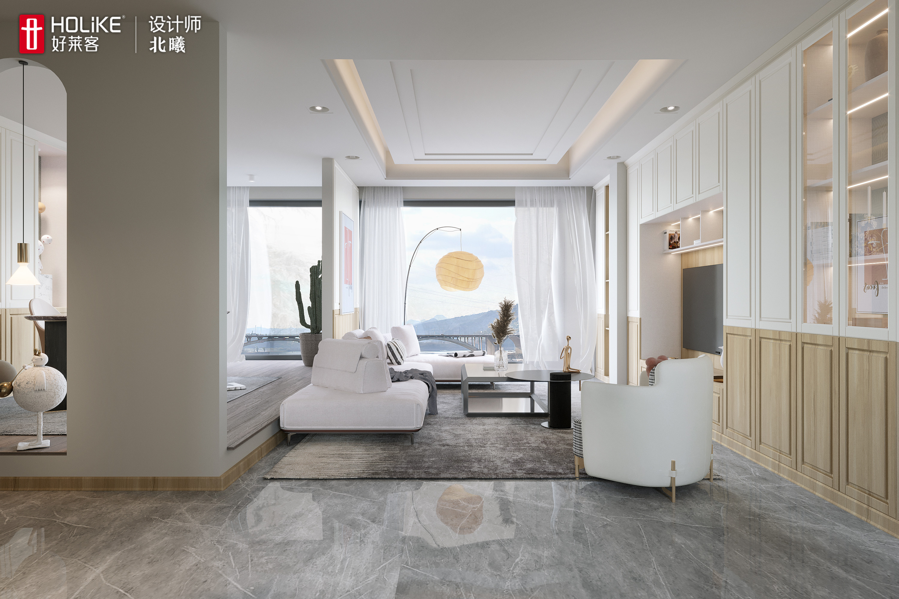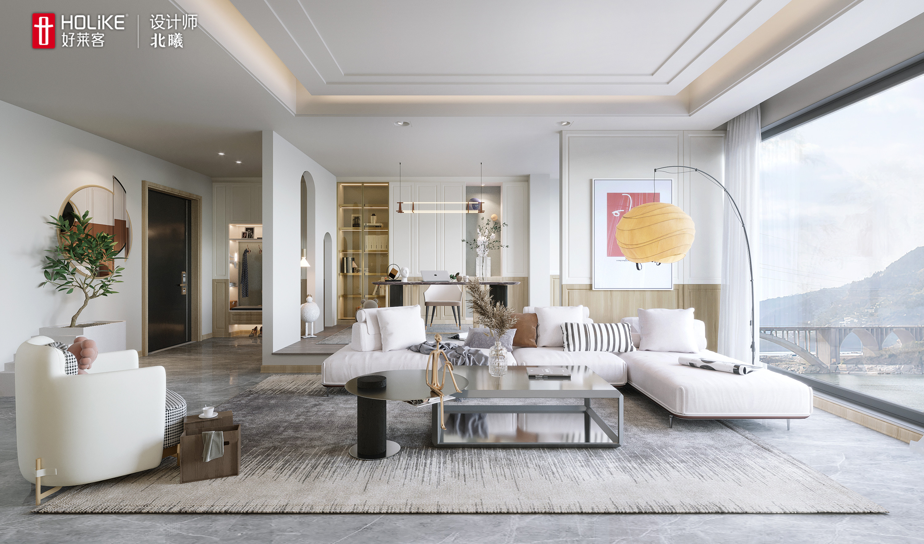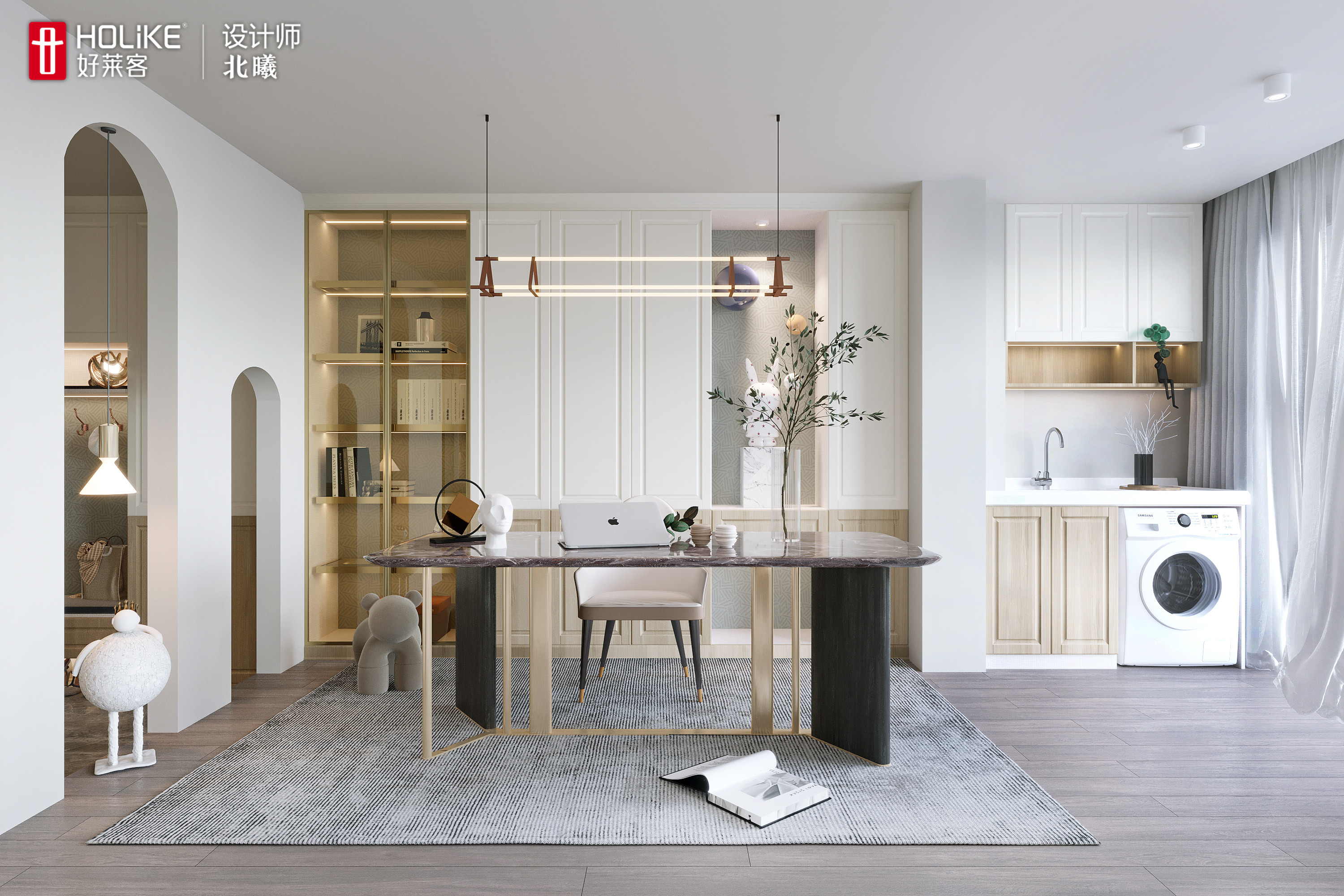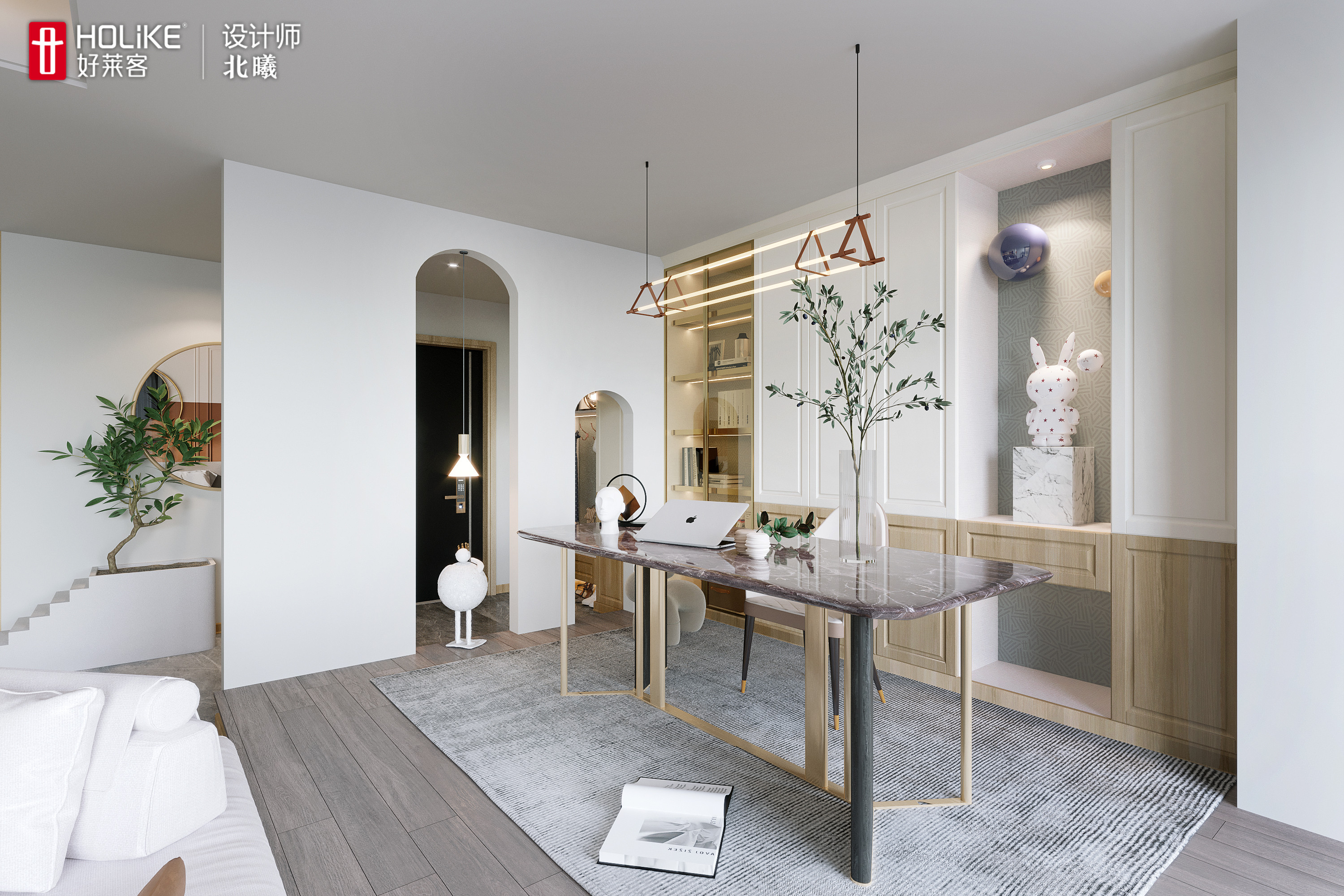 2、客厅后面留出空间打造开放式书房,作为男主人的工作室;