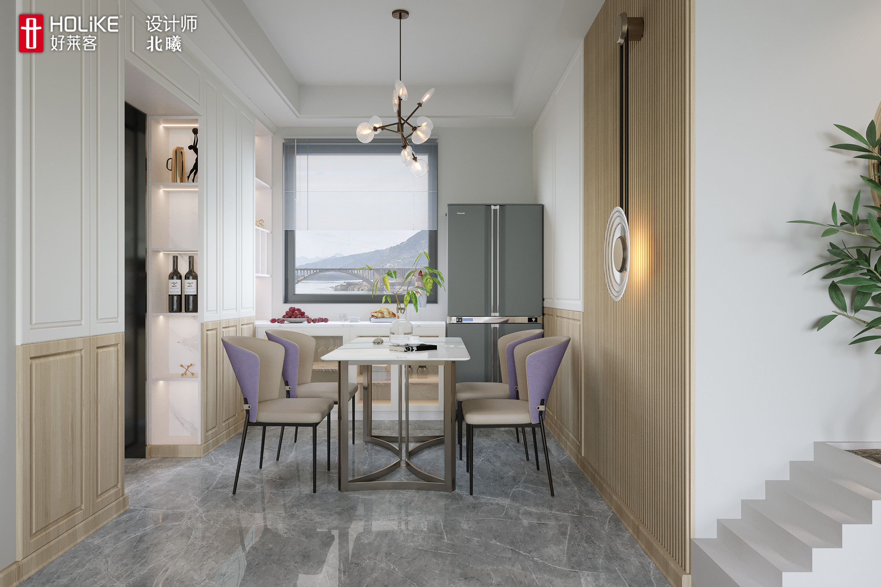餐厅延续主空间的基调,熹风胡桃搭配杏白色,再加上不规则吊灯的点缀,完美提升就餐时的氛围。