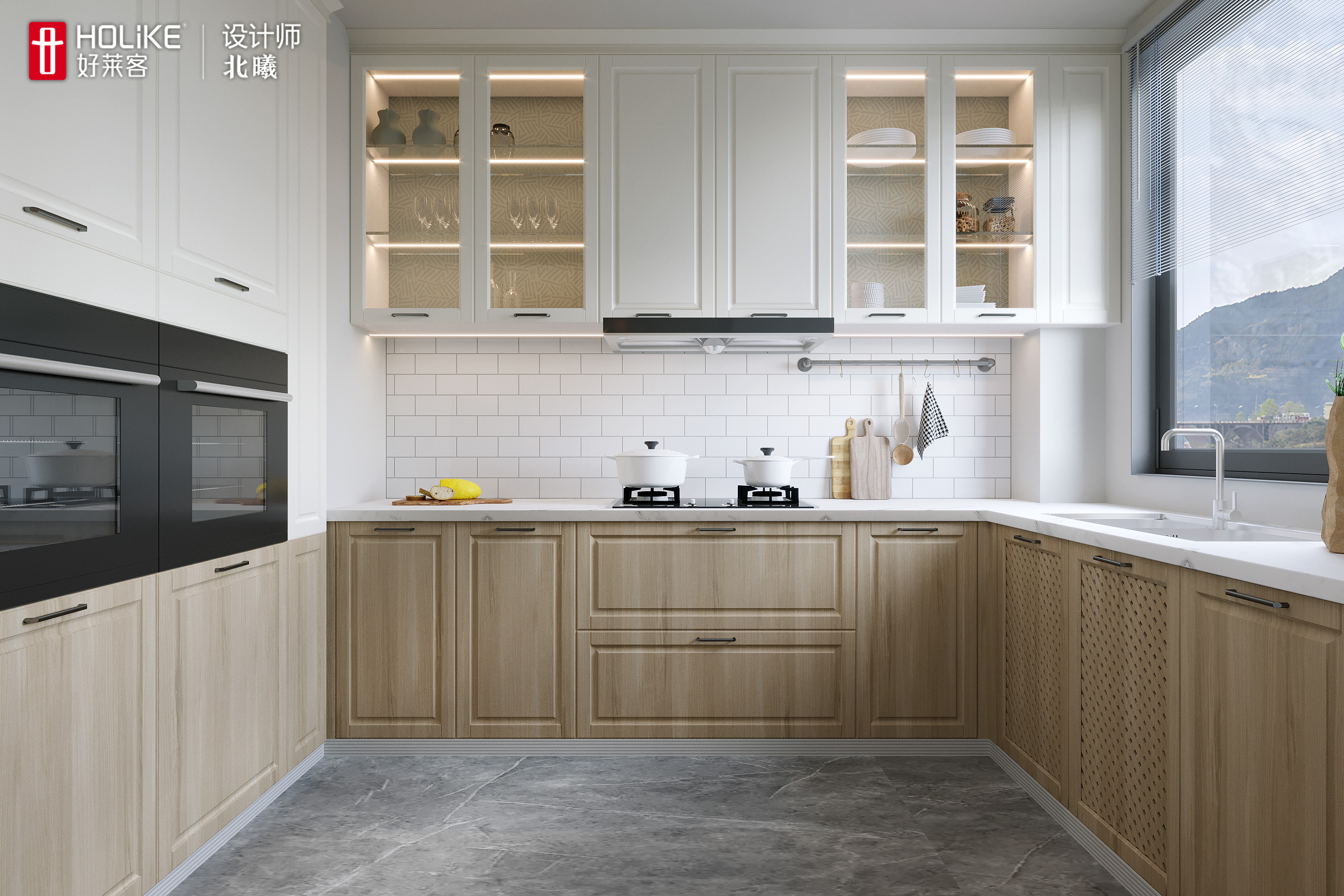 1、采用好莱客纳维亚系列设计, 运用木纹、布纹、石纹和金属等不同材料碰撞,凸显自然简欧的视觉风格;