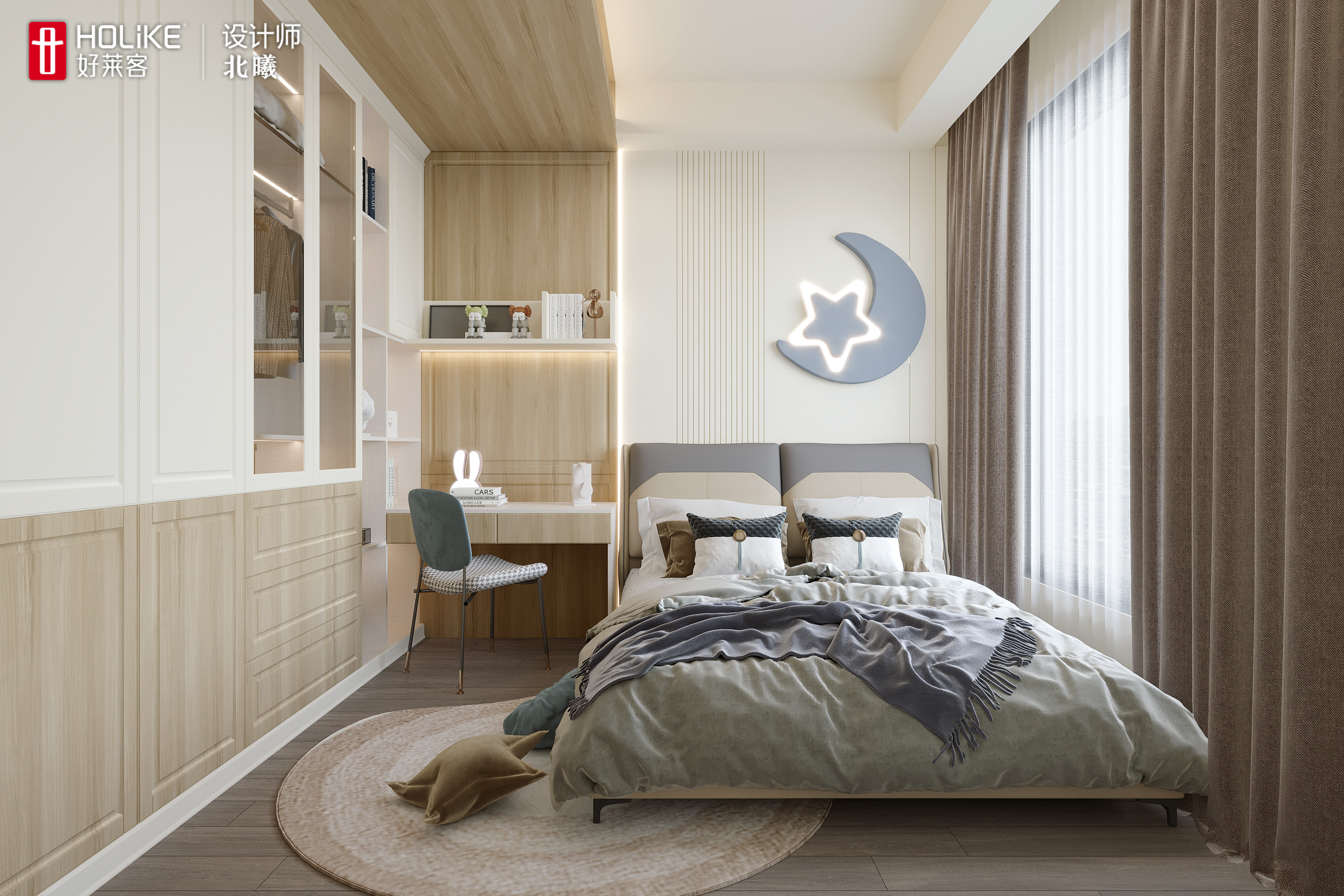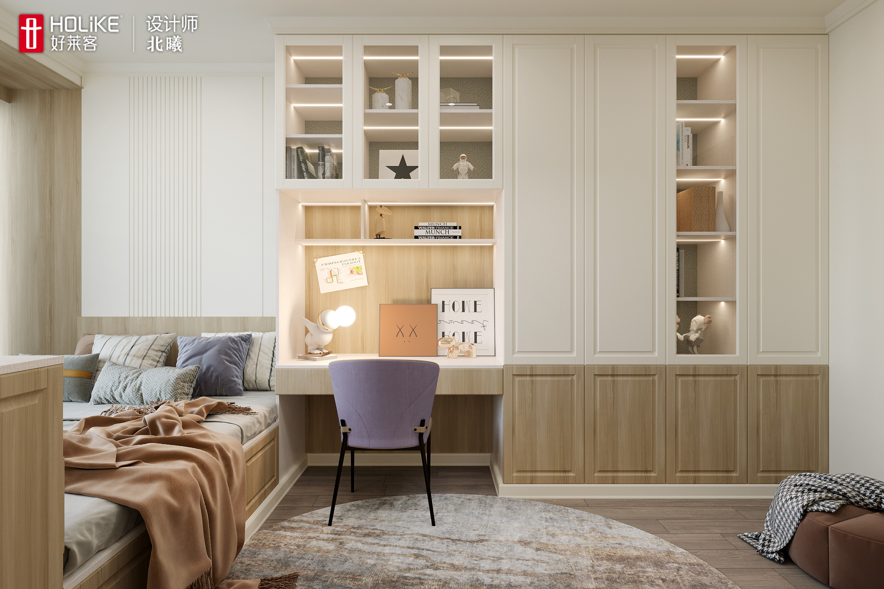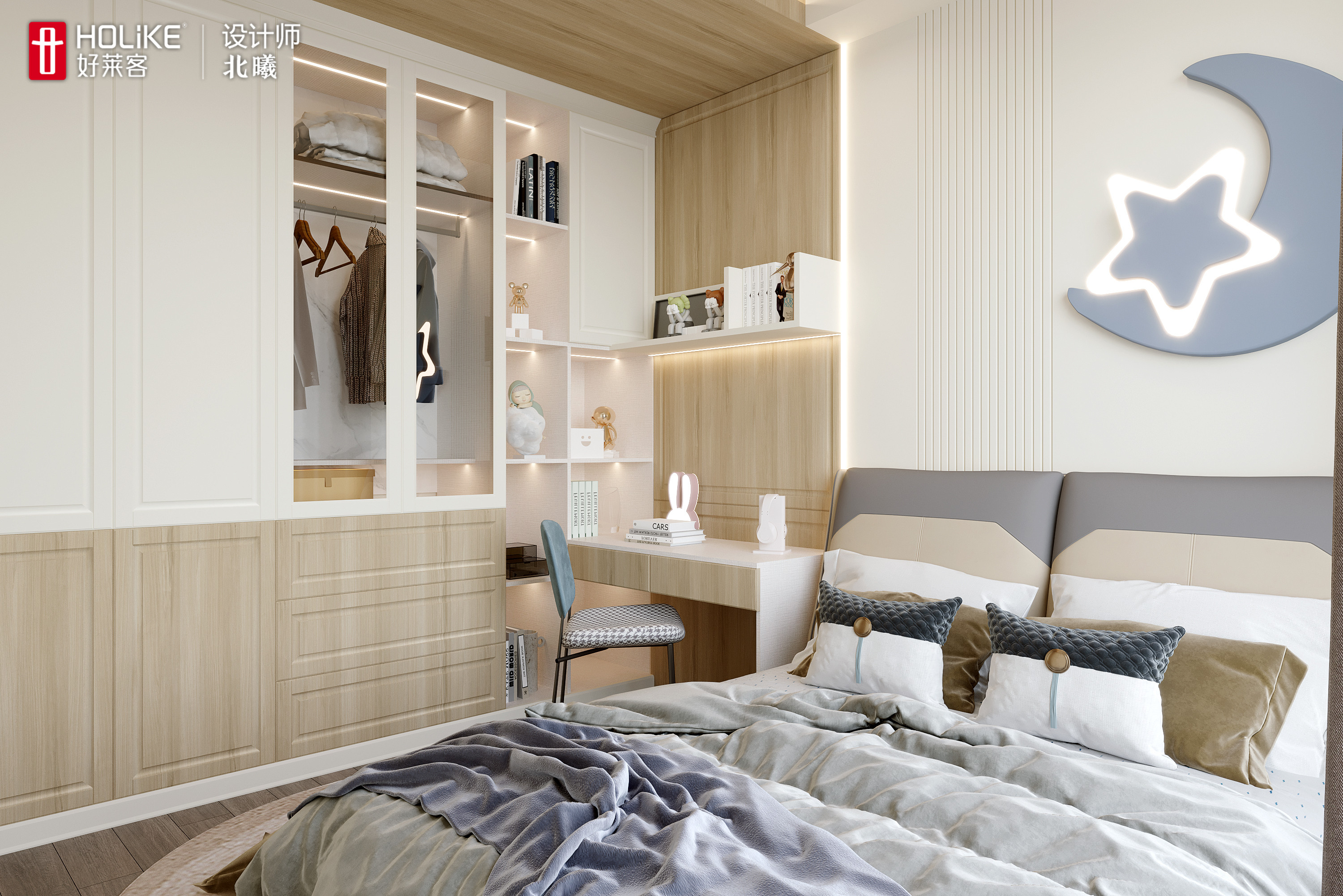 衣柜叠挂分区明确,能满足孩子的衣物收纳。衣柜延伸出书桌和床头一体化设计,再配上暖色系的灯光,是为孩子量身打造的学习区。