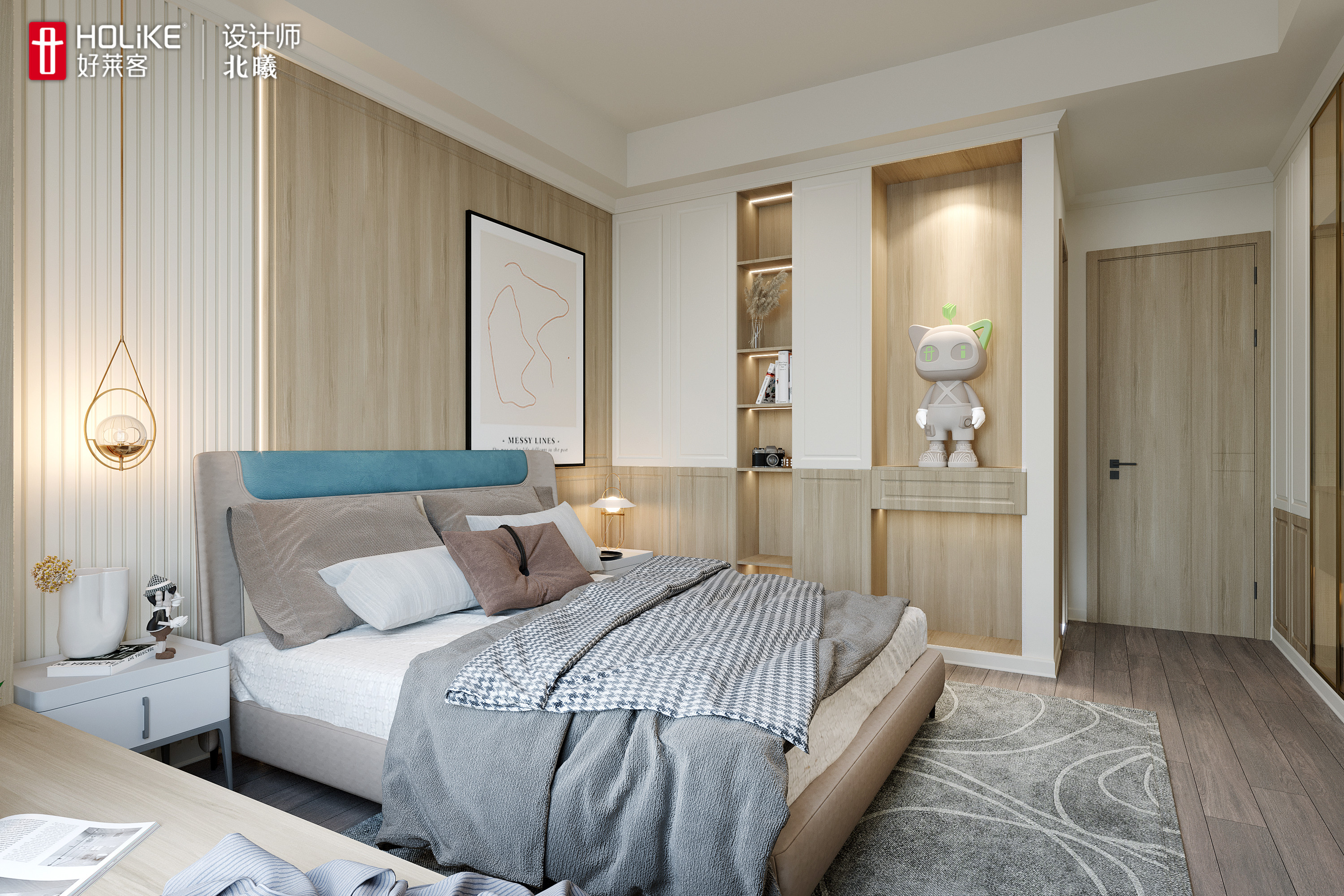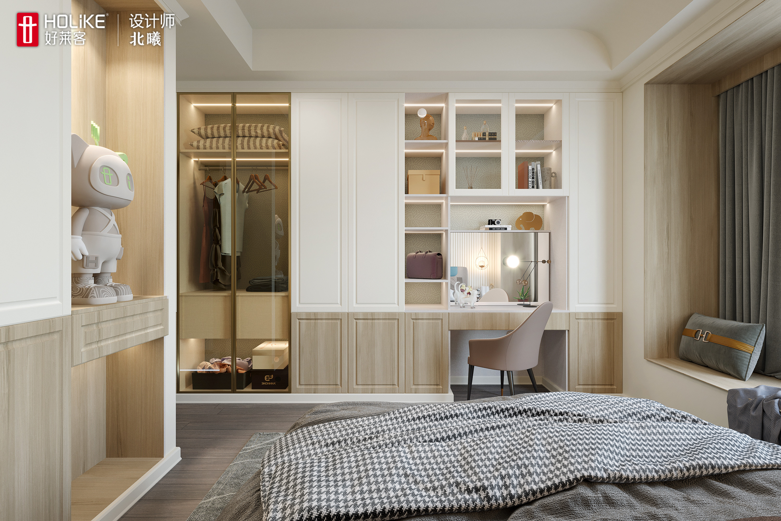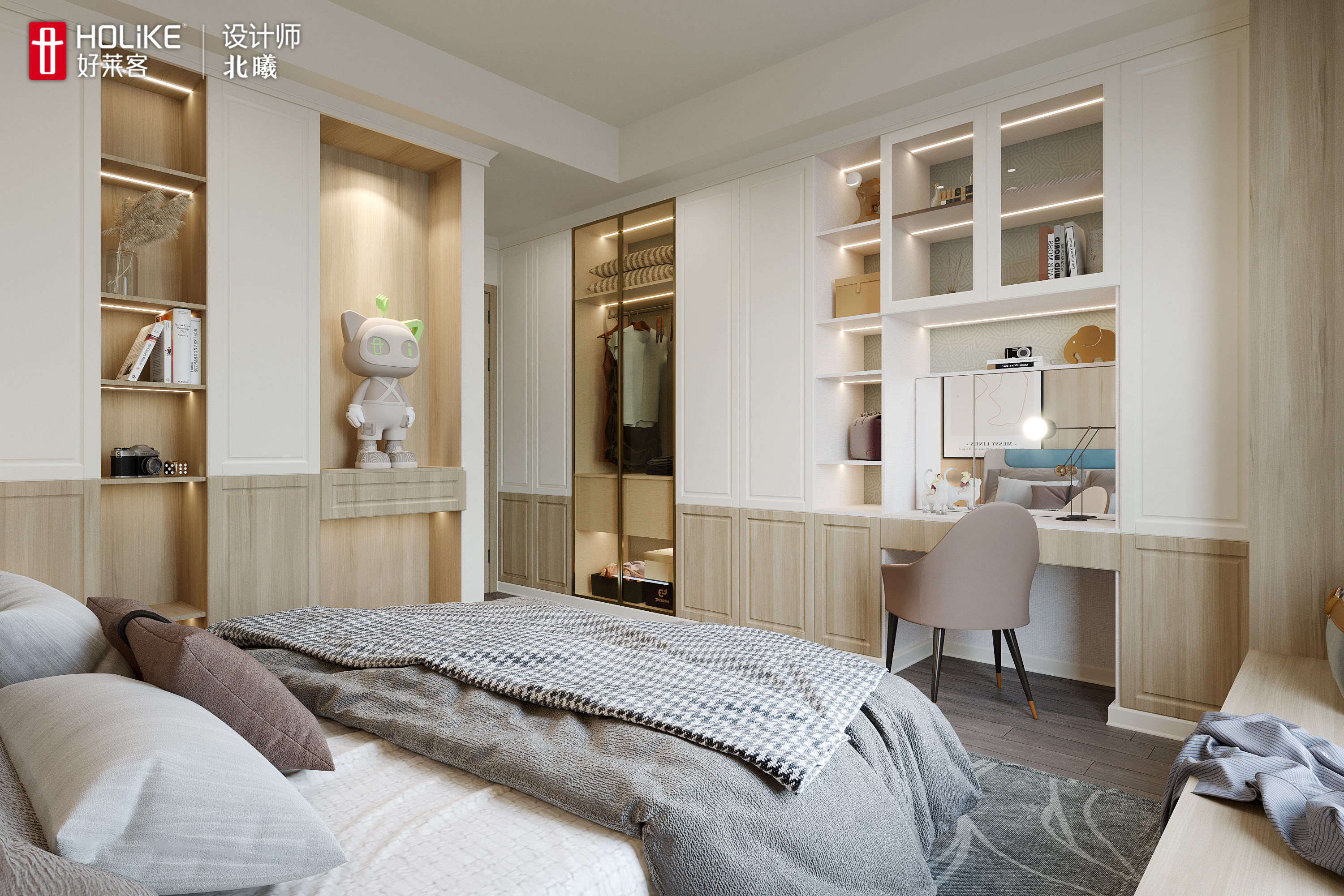 衣柜叠挂分区明确,能满足孩子的衣物收纳。衣柜延伸出书桌和床头一体化设计,再配上暖色系的灯光,是为孩子量身打造的学习区。