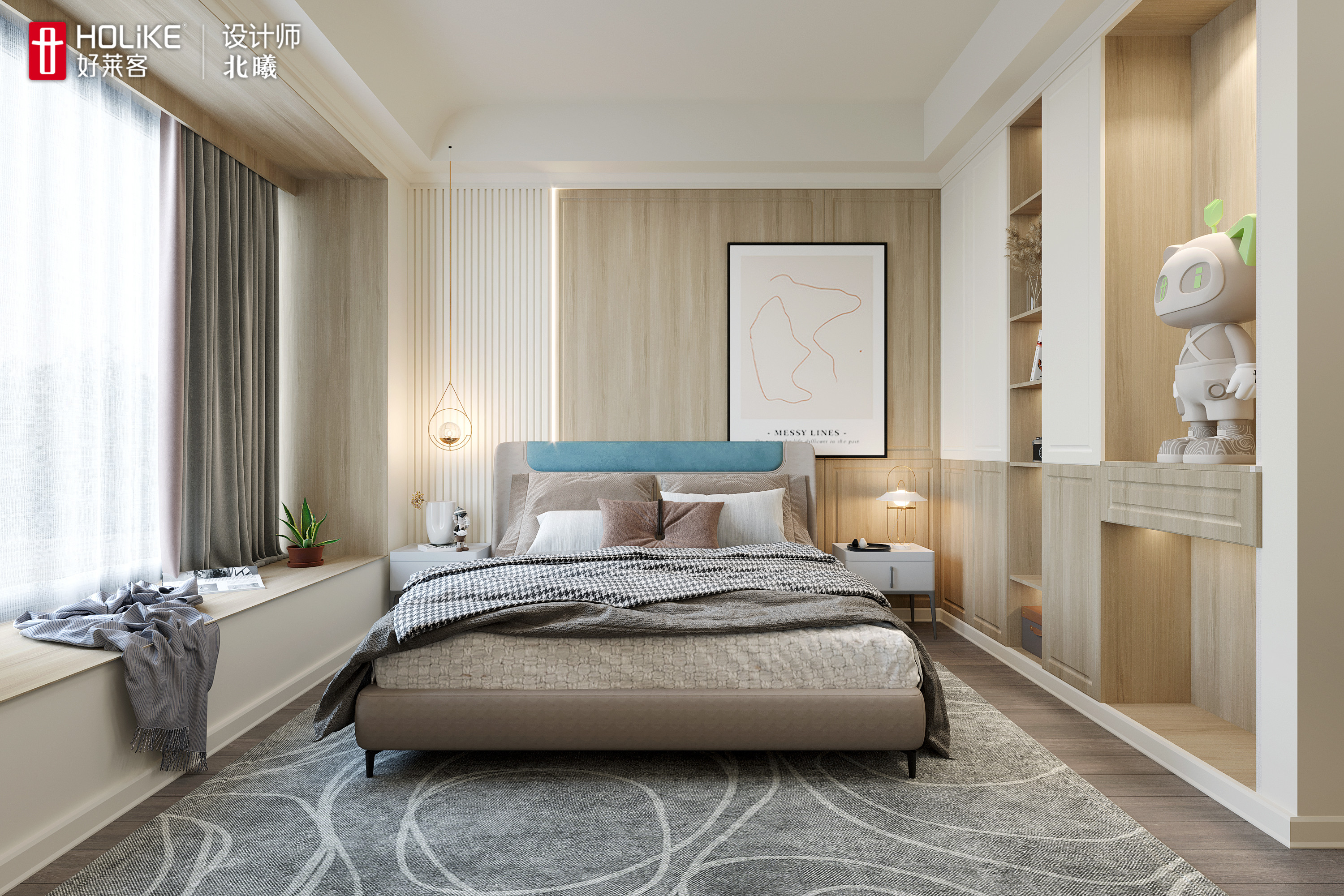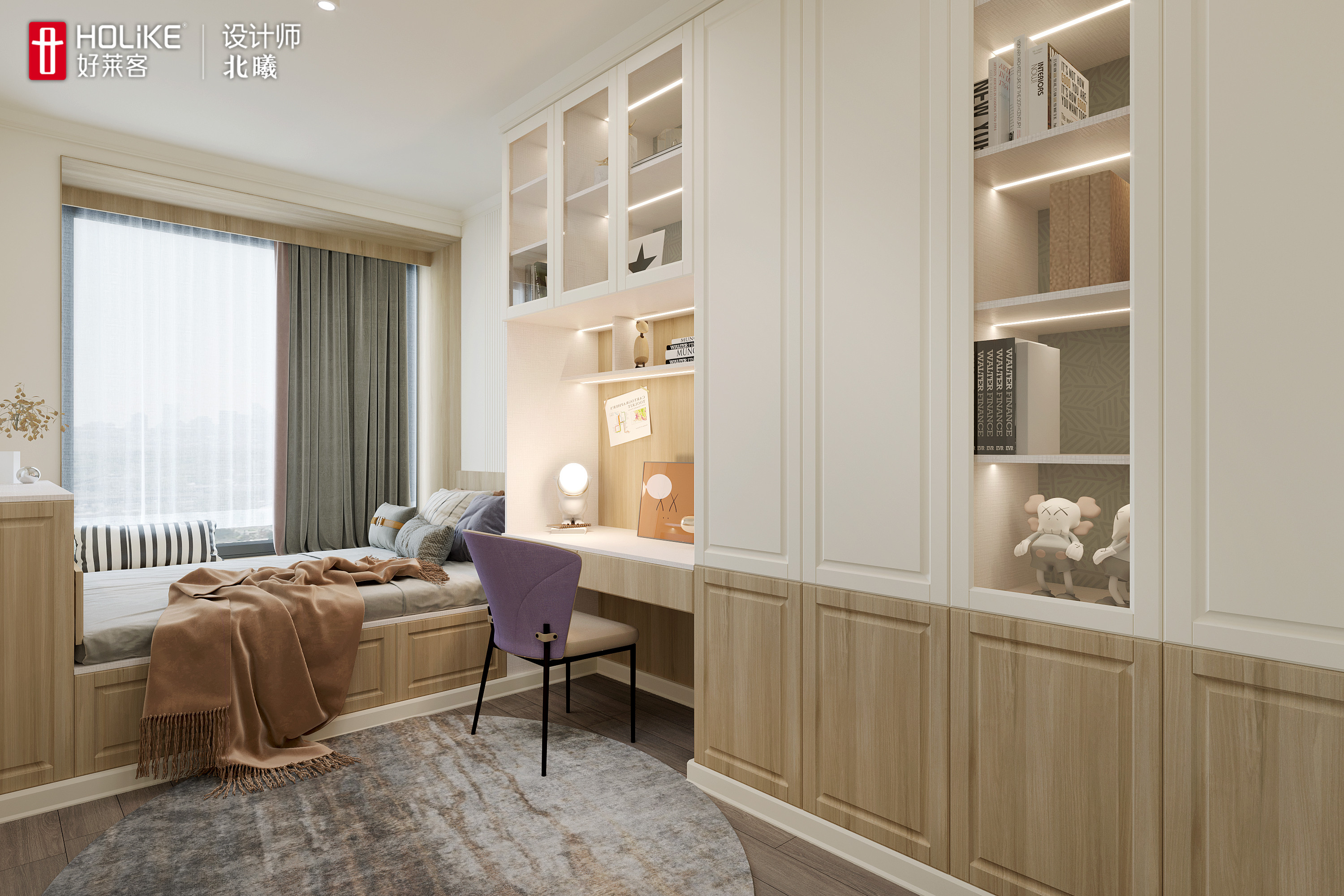 床的一侧开放柜放心爱的藏品,另一侧是飘窗,窗外风光无限,让人坐在、躺在飘窗上都会感觉非常惬意。