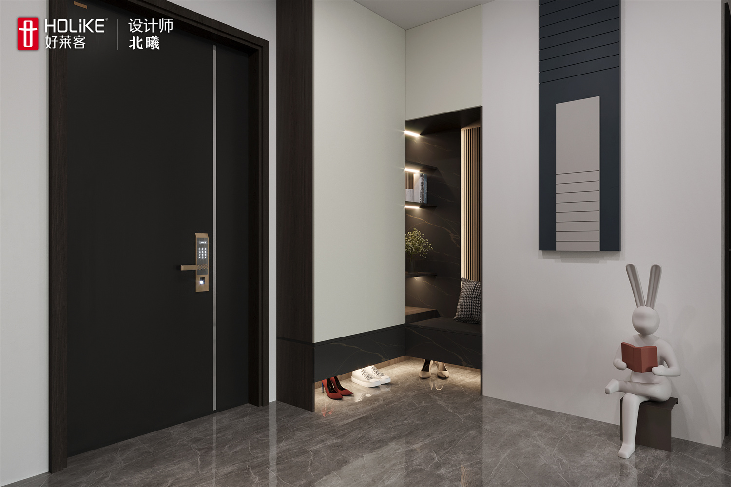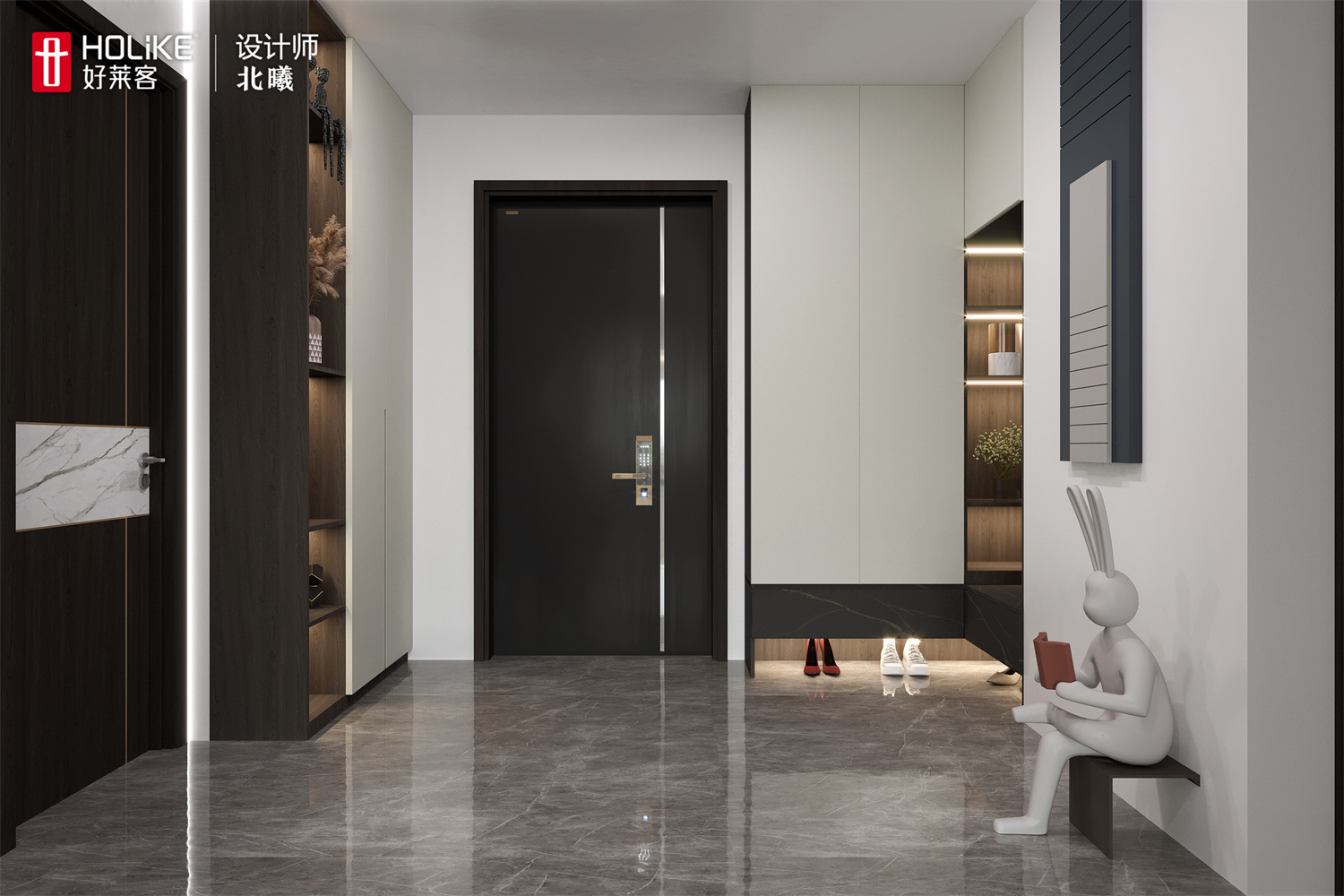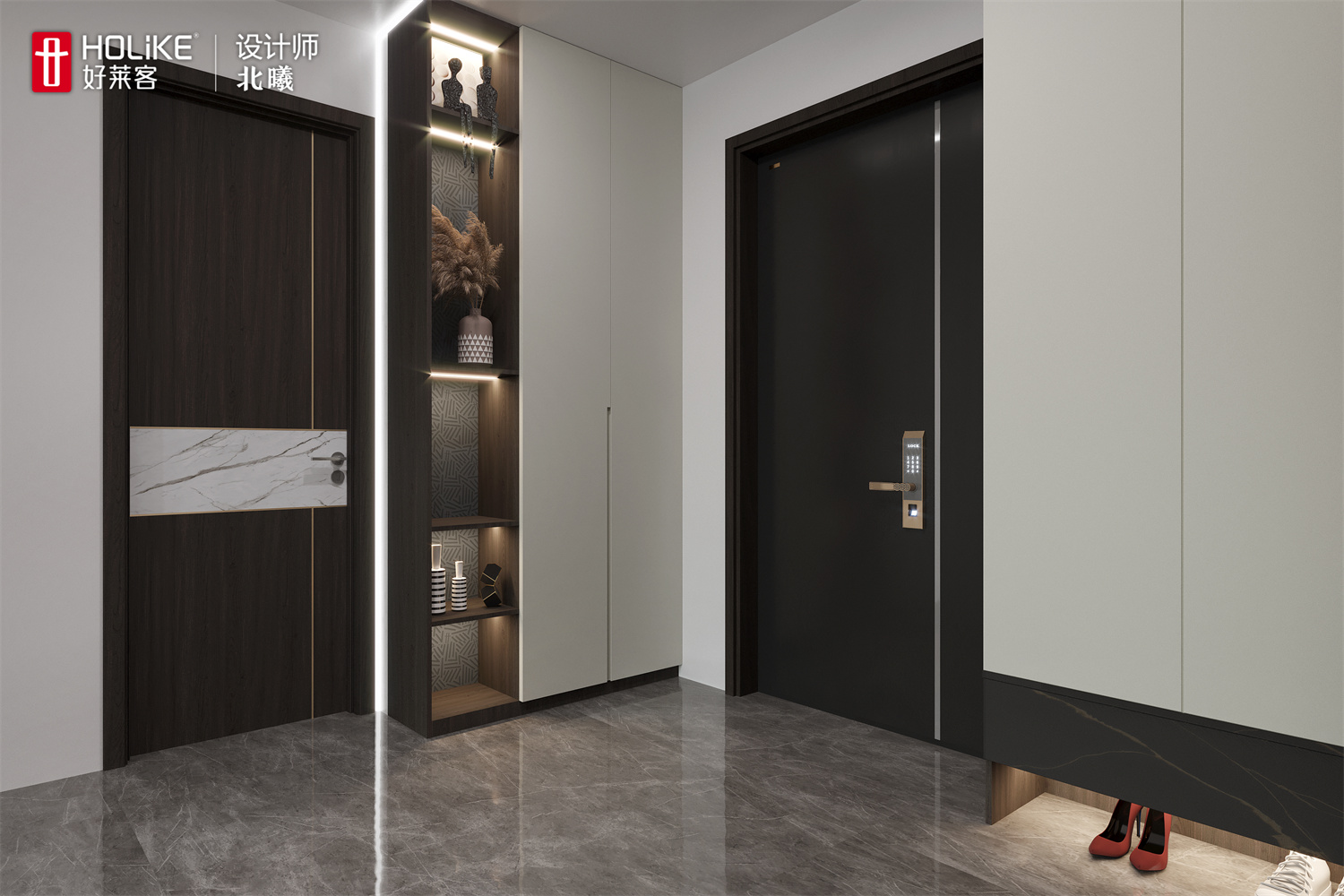 业主家进门先经过卧室再到客厅,如果有家庭成员晚归或有客人来访,进出门的声音很容易影响休息。因此卧室特意选用静音门,即使外面有人走动也不会打扰休息。