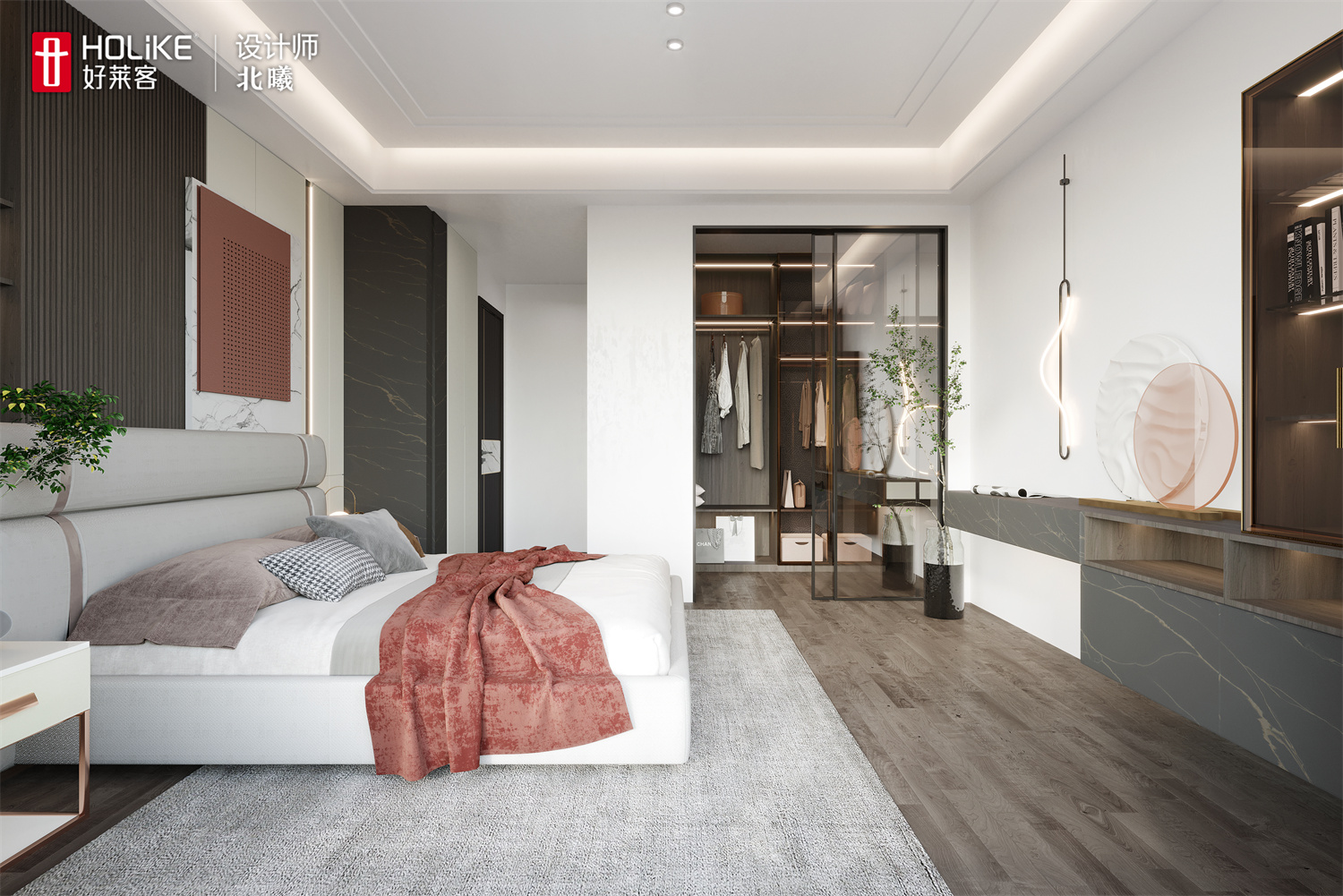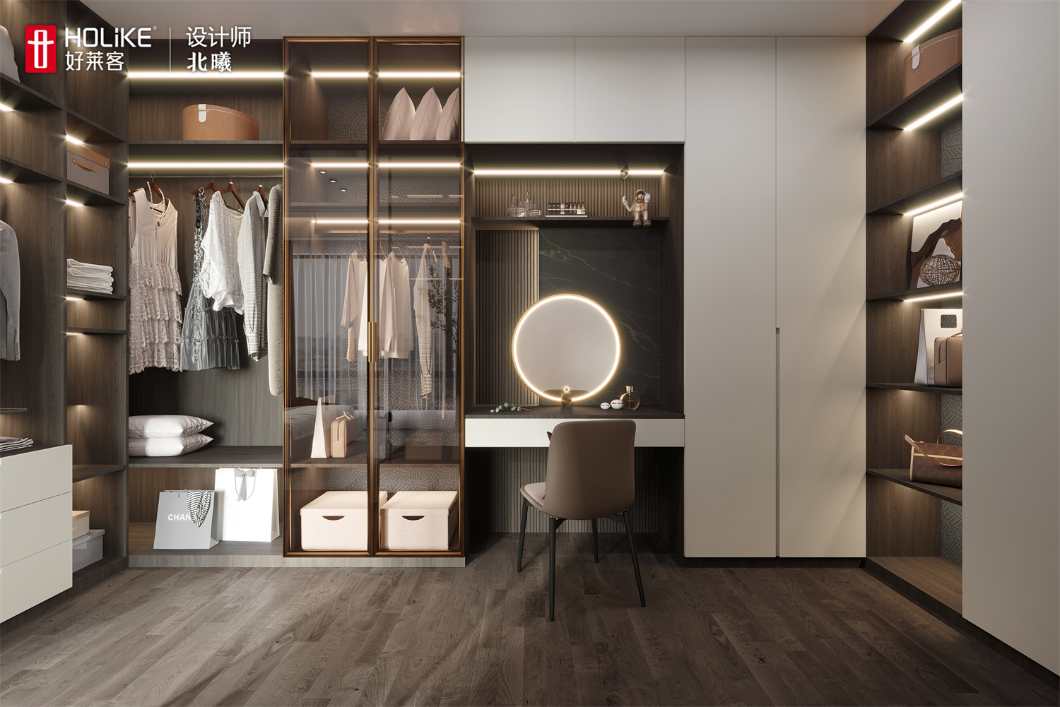 U型衣帽间集收纳、换衣、梳妆一体,通顶玻璃衣柜和开放格设计让卧室空间更加通透,巧妙地传达着业主的时尚品味。