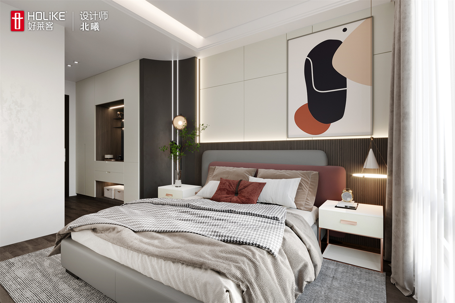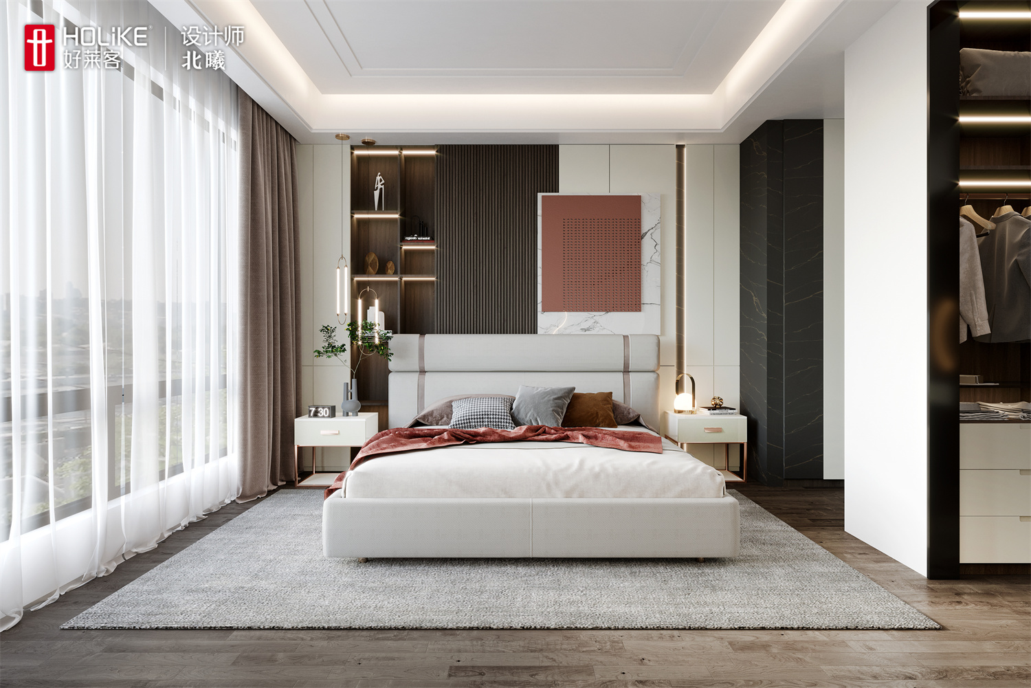 Paco希望卧室是宜居的休憩空间,相比繁复的装饰、艳丽的色彩,主卧整体线条简单、配色舒缓,有利于放松、休息。