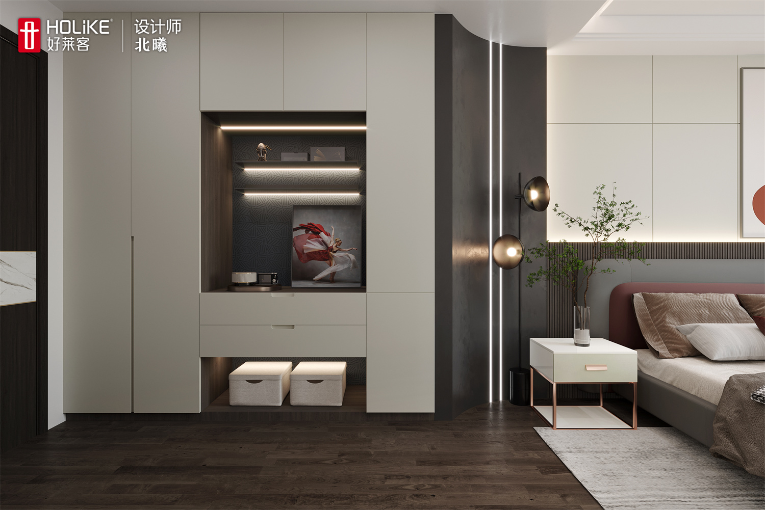 打造顶天立地衣柜,减少顶部积灰,易于打理卫生。柜体中部、底部留空,方便放置日常起居用品,十分贴心。