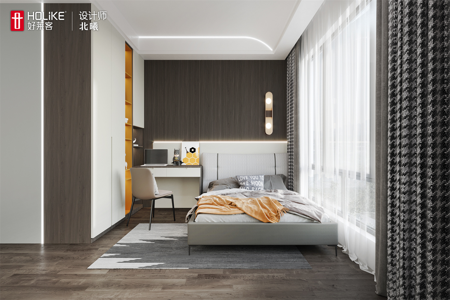Paco夫妇育有一子,正处于中考的关键期,于是设计师为他量身定制男孩房。衣柜+书桌组合式设计充分满足孩子学习、收纳、展示的需求。