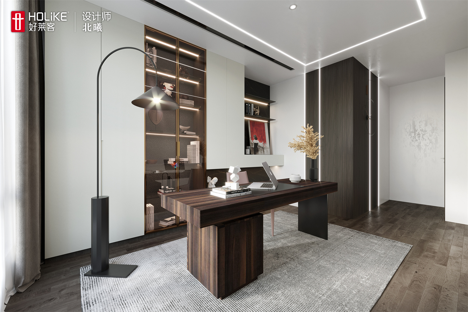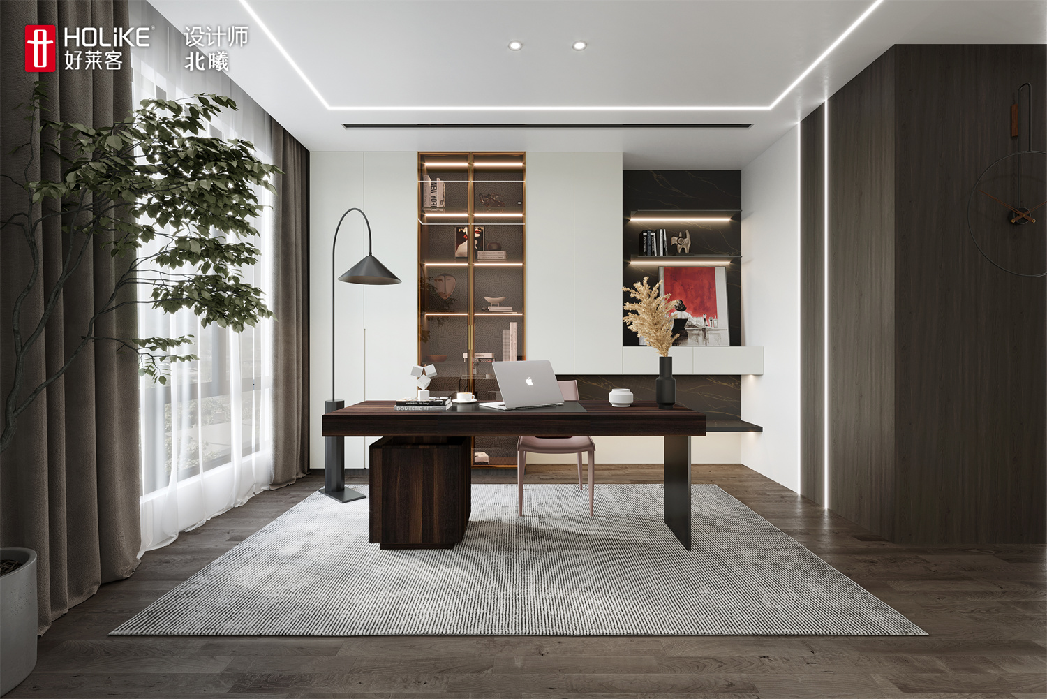 设计师设计了整墙书柜,运用好莱客独有的克里特橄榄和曙光白花色,与全屋意式极简风和谐一致。搭配长书桌,办公、阅读、洽谈都可以在这里完成,Paco对这个设计赞赏不已。