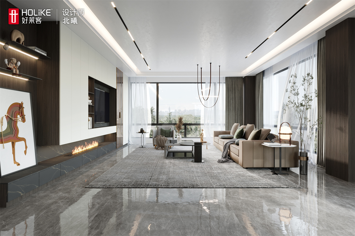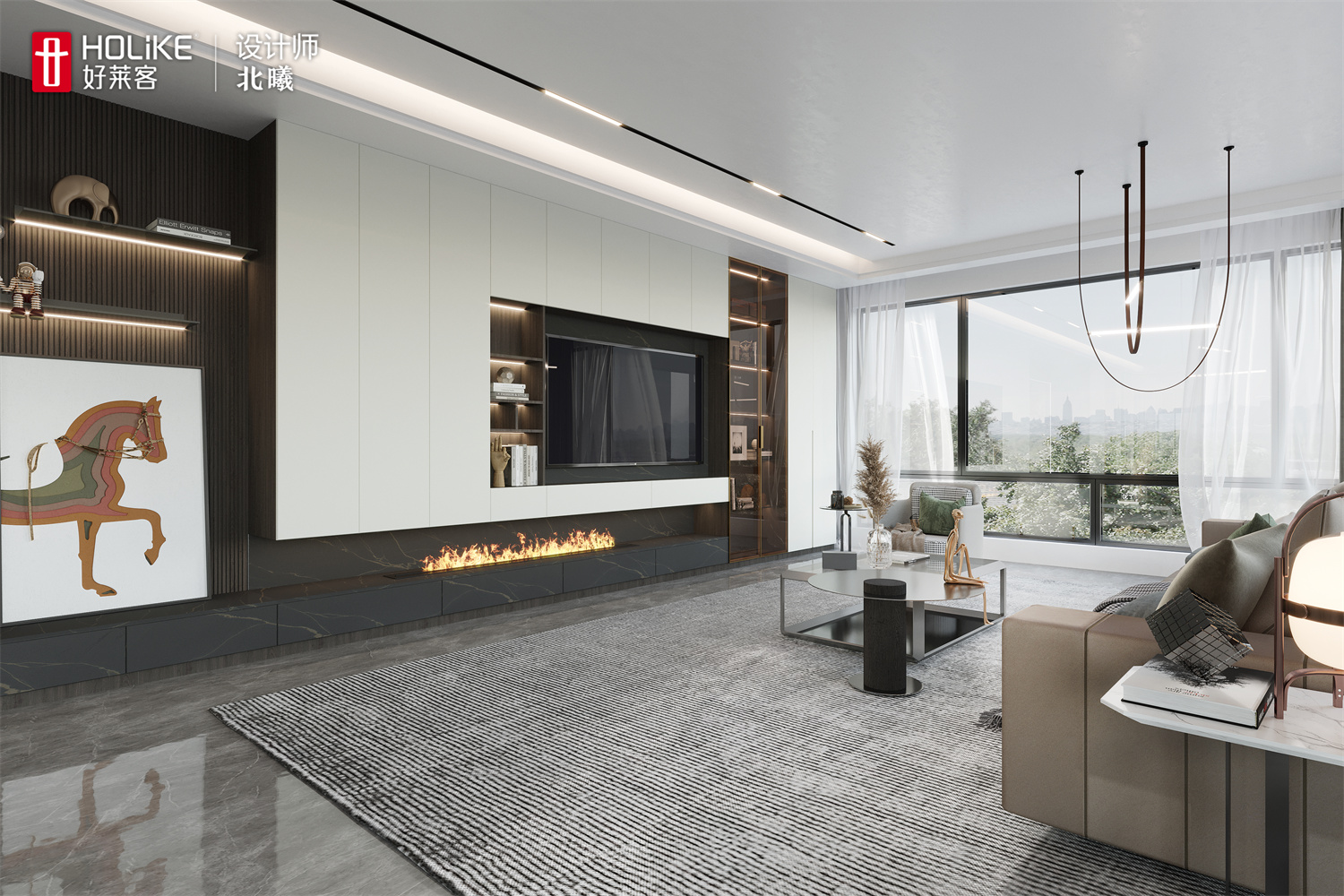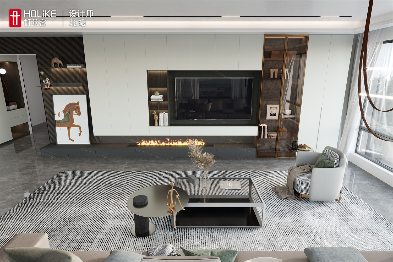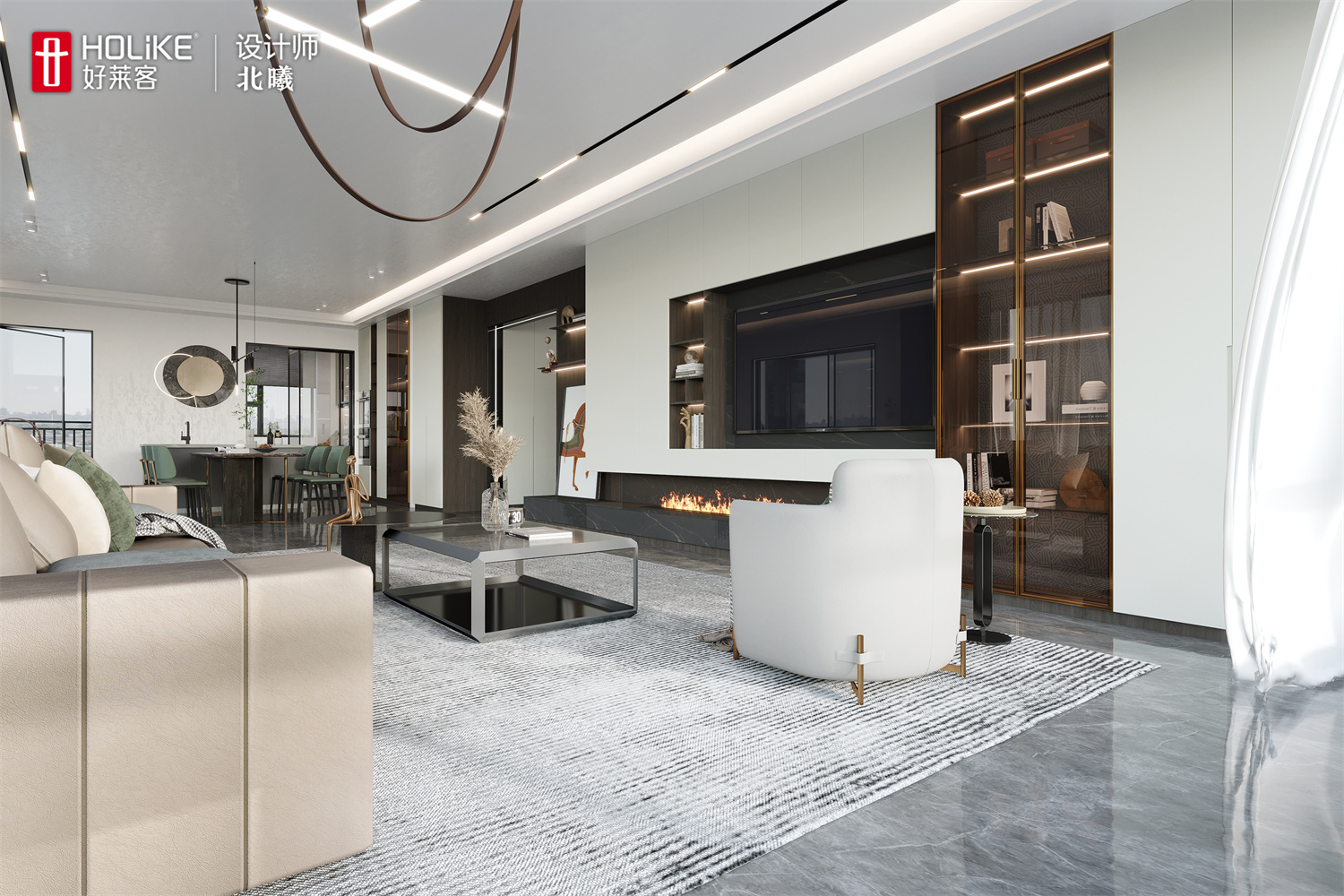 曙光白花色与茶色玻璃柜搭配,充满格调,打造出时尚高级的视觉效果。