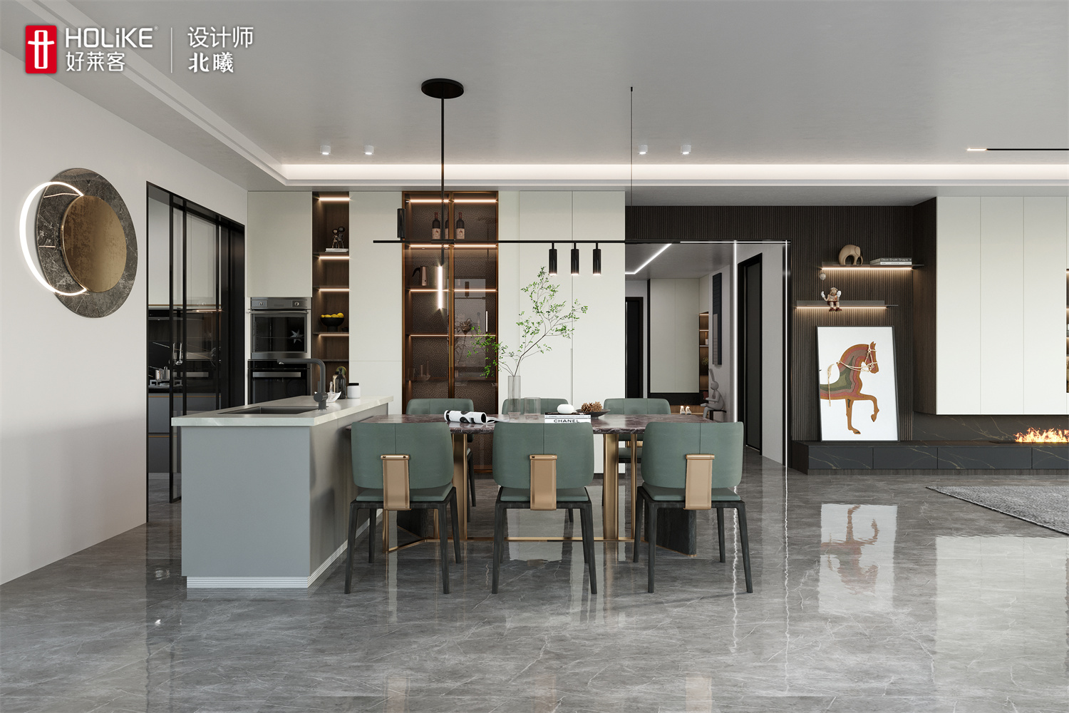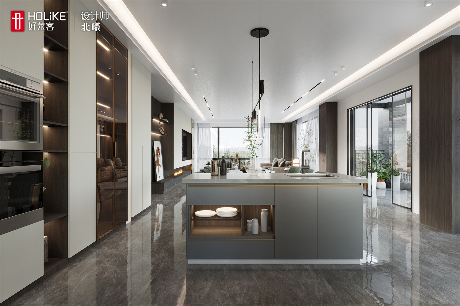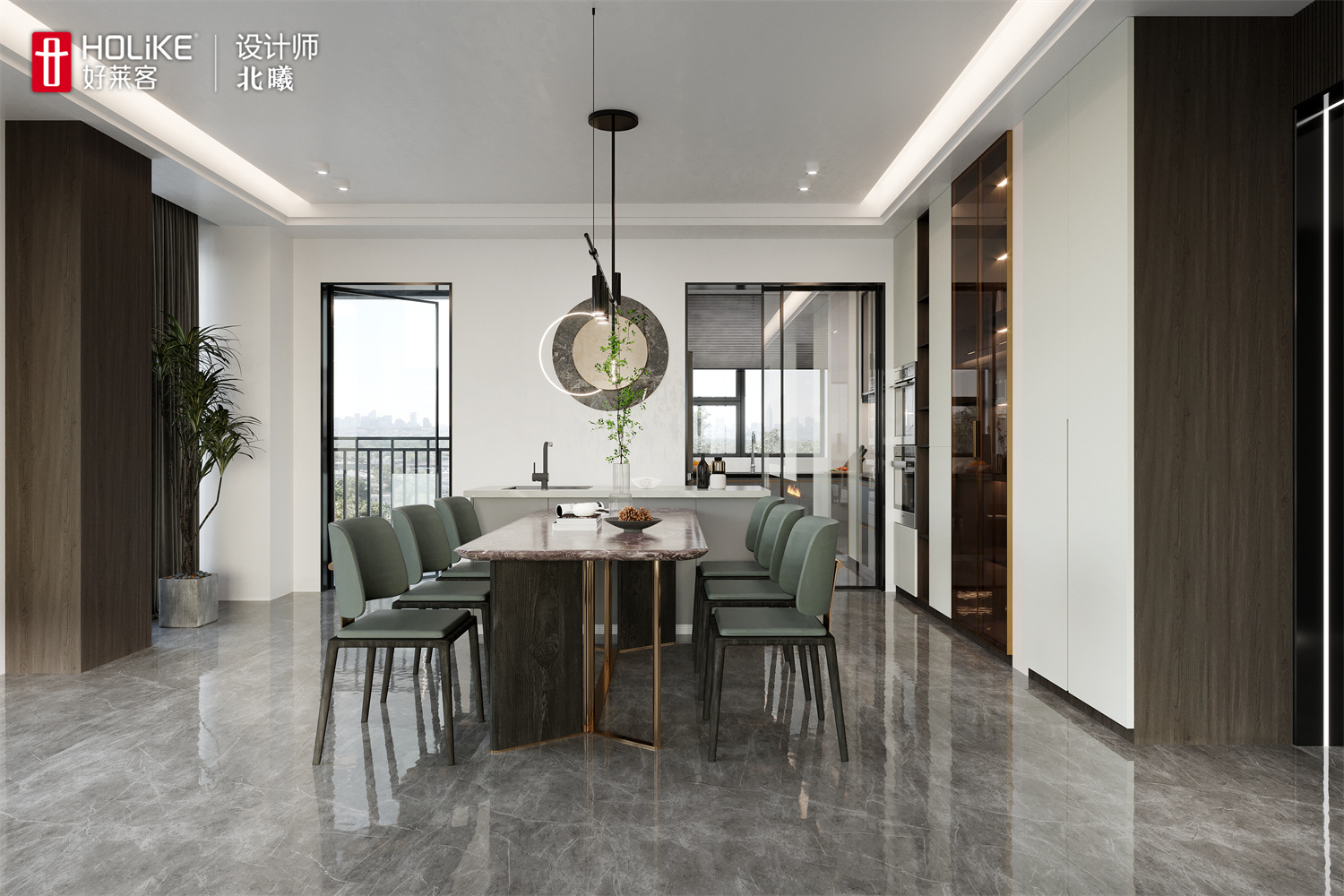 餐桌与岛台相连,巧妙地打造出西厨区域。中央岛台不仅增加更多收纳空间,同时也有利于烹饪时的互动。