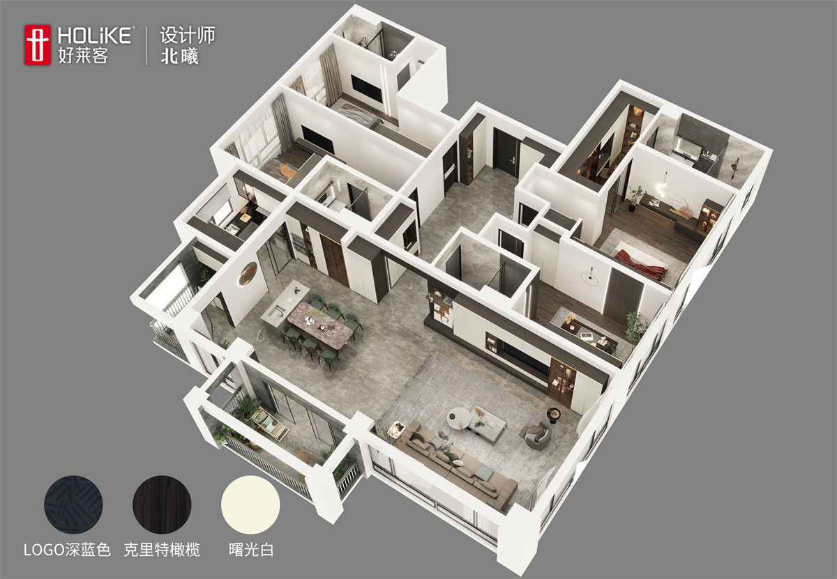 1、家具选用好莱客瓦尔登湖Ⅱ系列,克里特橄榄、曙光白等多种潮流花色搭配,打造意式极简美家