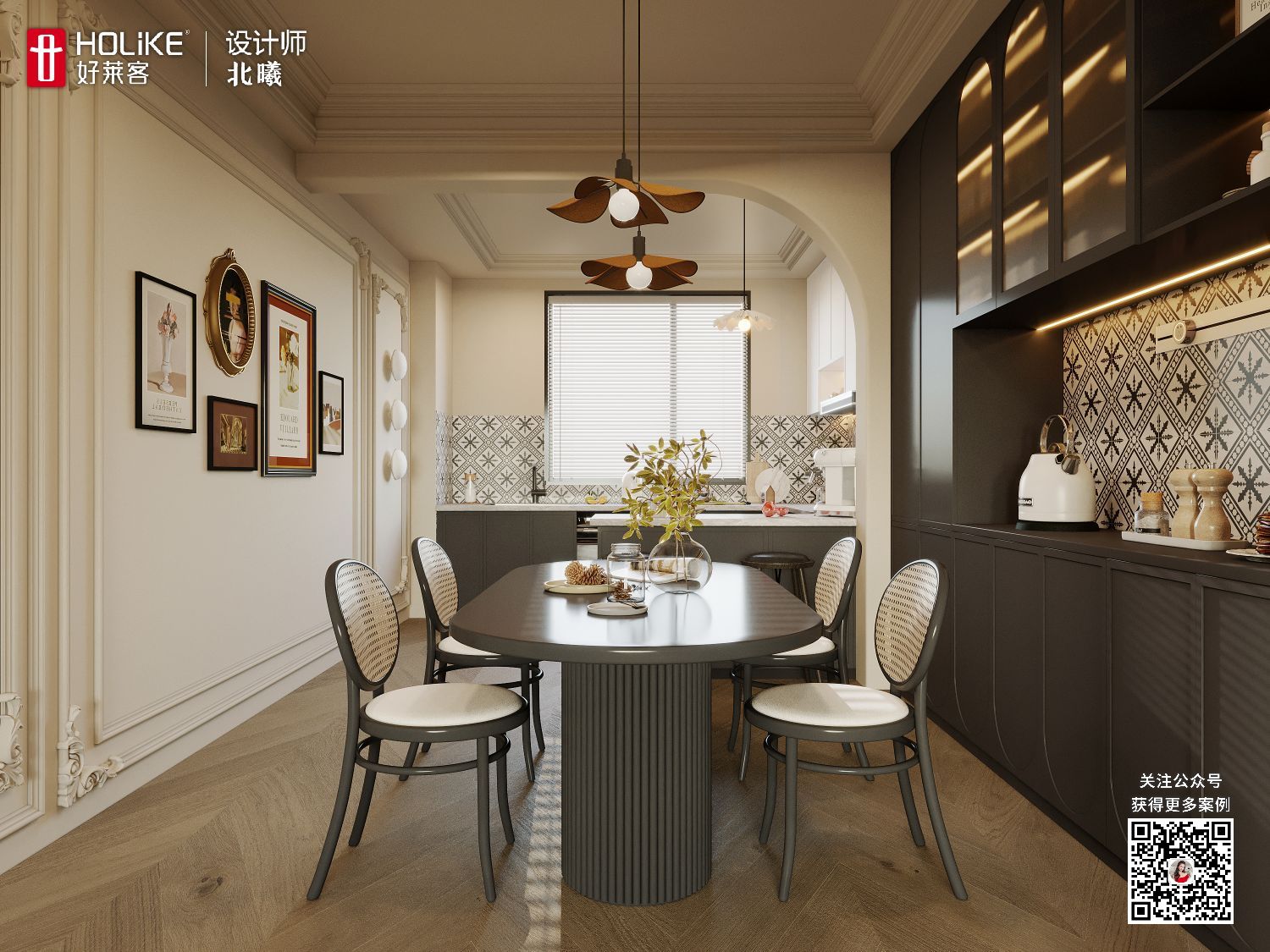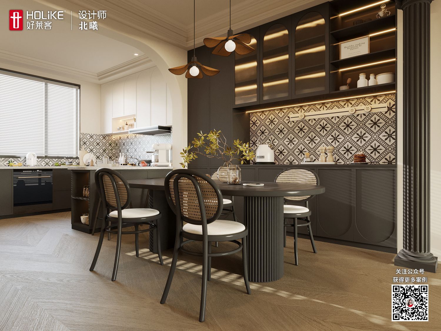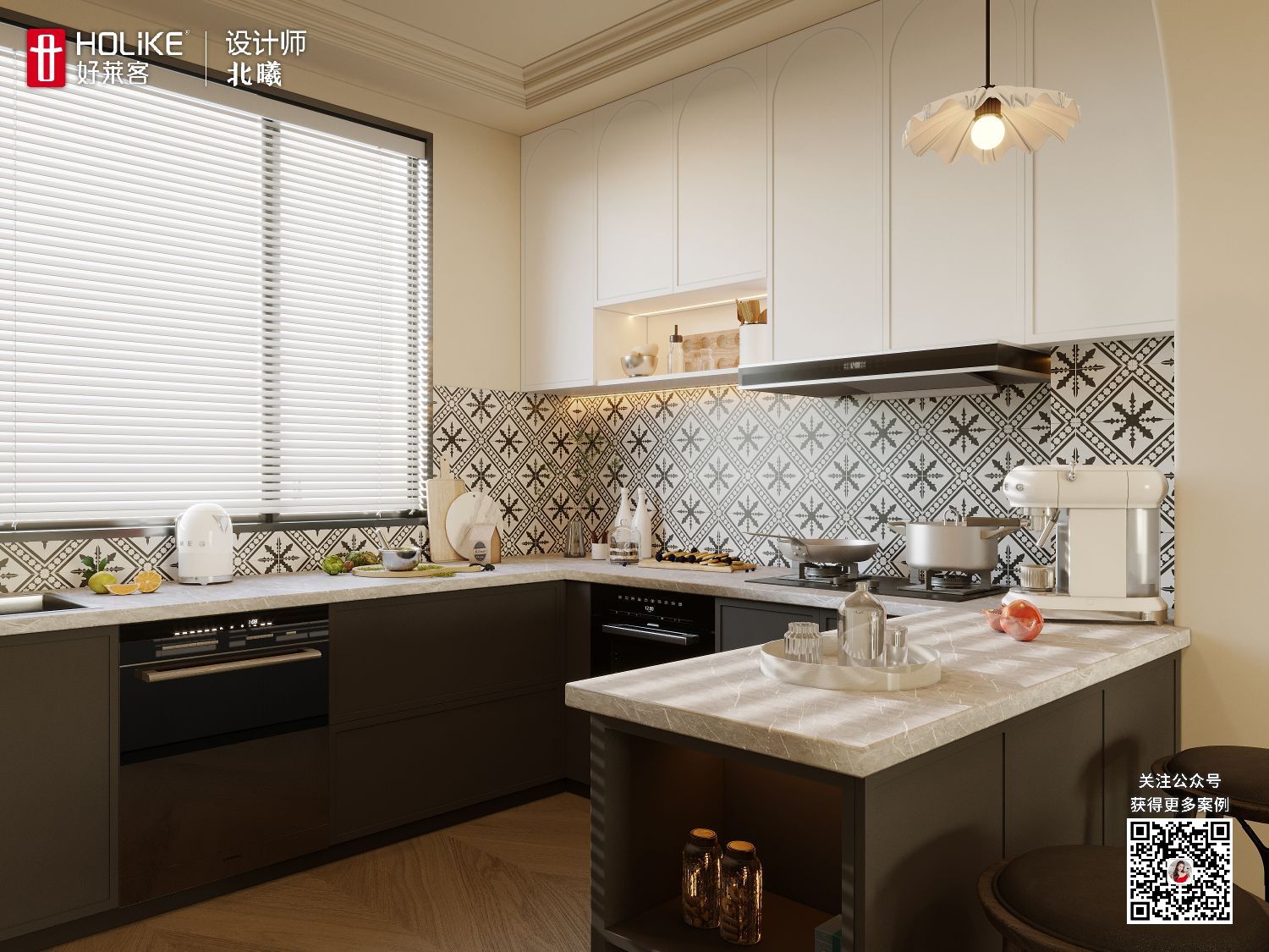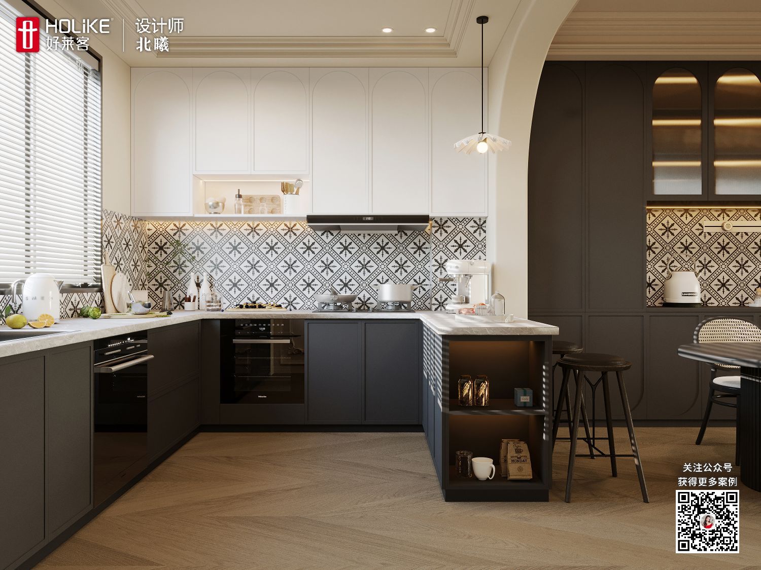 橱柜由杏白吊柜+中木灰地柜组合而成